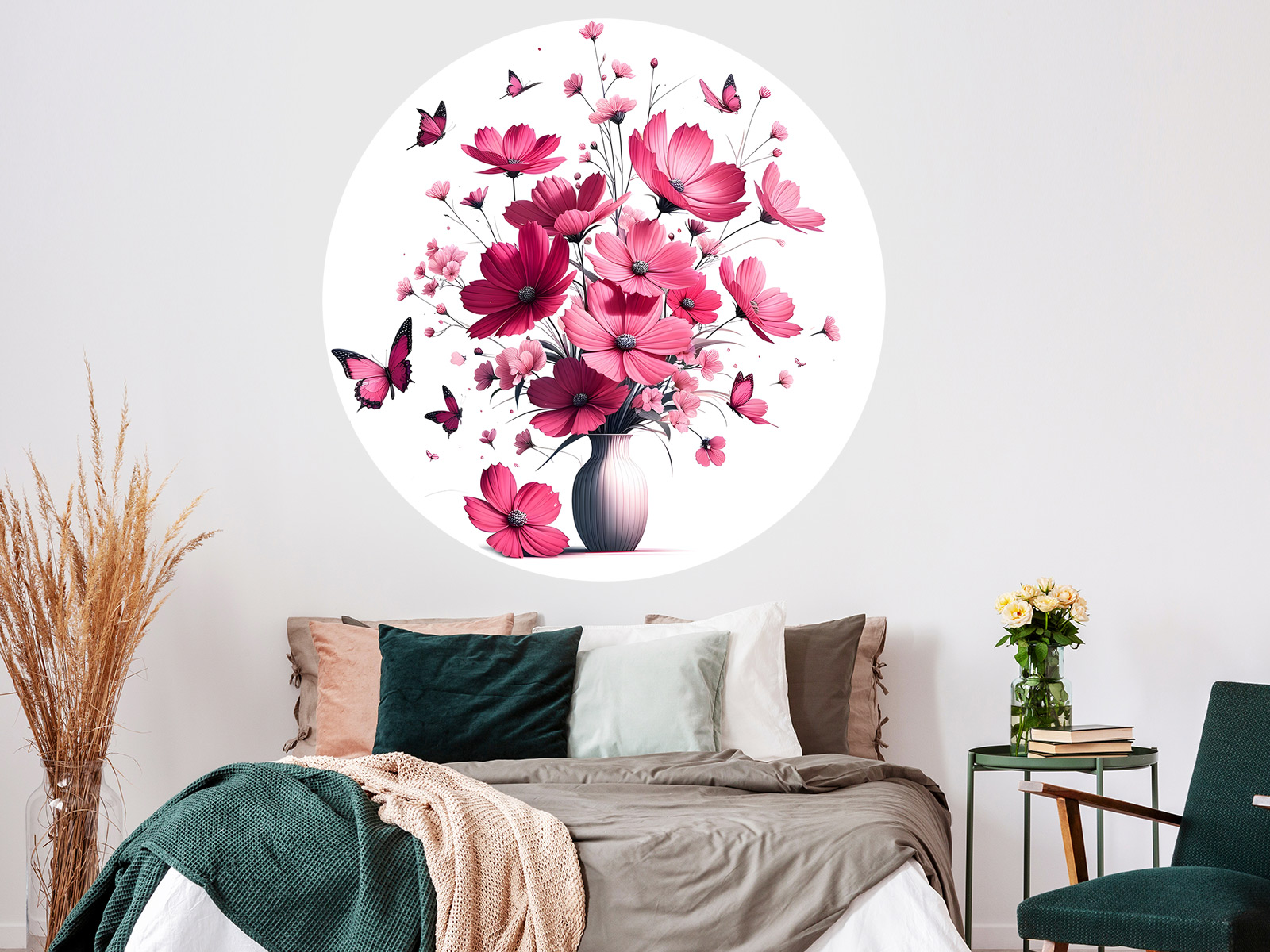 Samolepka „Růžové květiny ve váze“ přináší do interiéru jemnost, eleganci a pozitivní energii, která zútulní každý domov. Dominantou motivu je bohatá kytice růžových květů rozkvétajících do všech stran, doplněná lehkými okvětními lístky a elegantně poletujícími motýly, které scéně dodávají vzdušnost a romantický nádech. Tóny růžové působí hřejivě a harmonicky, díky čemuž se design hodí nejen do ložnic či obývacích pokojů, ale i do moderních interiérů či dámských prostor, kde vytvoří jemný dekorativní středobod.