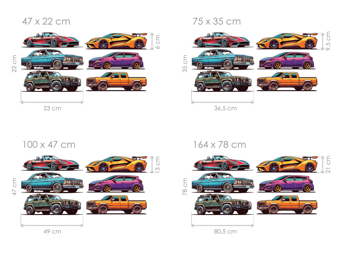 Samolepka na zeď „Sada aut“ přináší pestrou kolekci různých typů automobilů – od sportovních vozů přes SUV až po klasické pickupy – která vnese do interiéru hravost, dynamiku a radost z objevování. Díky rozdělení do jednotlivých motivů umožňuje kreativní rozmístění podle vlastních představ a snadno se přizpůsobí prostoru dětského pokoje, herny i stylového koutku pro malé automobilové nadšence. Barevné provedení a detailní ilustrace působí moderně a zároveň přátelsky, podporují fantazii a vytvářejí vizuálně zajímavou dekoraci, která roste spolu s dítětem a nikdy neomrzí.