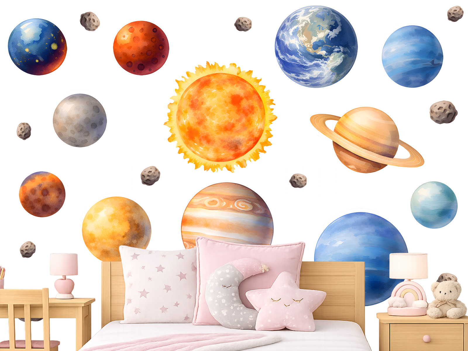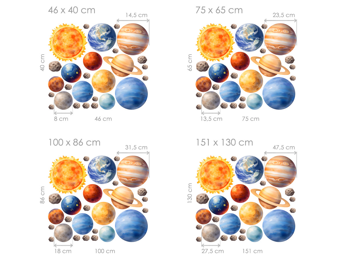 Samolepky na zeď Sada planet přenesou děti do kouzelného světa vesmíru plného planet, hvězd a dobrodružství. Ilustrace Slunce, planet i drobných asteroidů působí hravě a přitom jemně, díky čemuž se skvěle hodí do dětského pokoje, herny nebo koutku pro malé objevitele. Samolepky lze na zdi libovolně rozmístit, vytvořit vlastní sluneční soustavu nebo si s dětmi hrát na vesmírnou mapu a povídat si o planetách. Barevnost je sladěná tak, aby prostor zútulnila a zároveň podněcovala dětskou fantazii, zvědavost a zájem o vesmír. Sada působí lehce a vzdušně, krásně doplní interiér a promění obyčejnou stěnu v hravé místo plné snů o cestách mezi hvězdami.