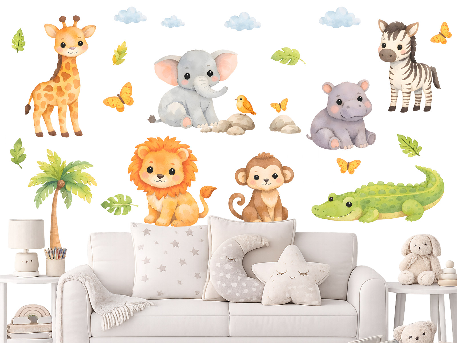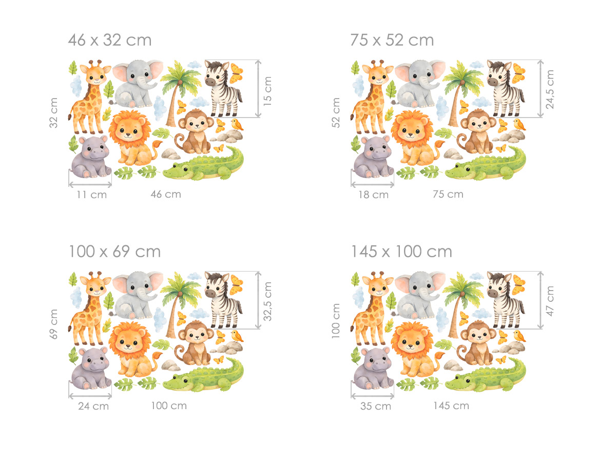 Samolepky na zeď Safari zvířátka přenesou do dětského pokoje hravý svět exotické přírody plný roztomilých zvířecích kamarádů. Žirafa, sloník, lev, opička, hrošík, zebra i krokodýl jsou ztvárněni v jemném akvarelovém stylu s hebkými barvami a přátelskými výrazy, které působí klidně a harmonicky. Motivy jsou doplněny drobnými detaily, jako jsou listy, motýlci či obláčky, díky nimž vzniká veselá a zároveň vyvážená kompozice. Samolepky lze rozmístit podle vlastní fantazie a snadno tak vytvořit útulnou safari scénu nad postýlkou, postelí nebo hracím koutkem, která podnítí dětskou představivost a promění pokoj v místo plné pohody a dobrodružství.