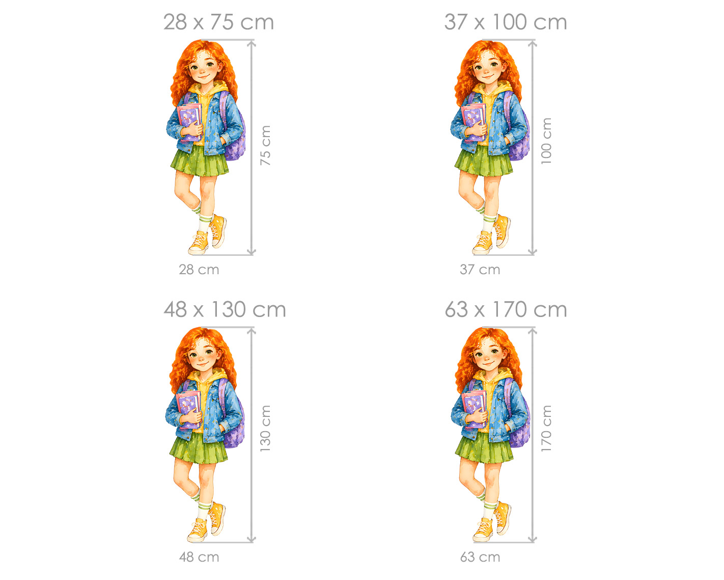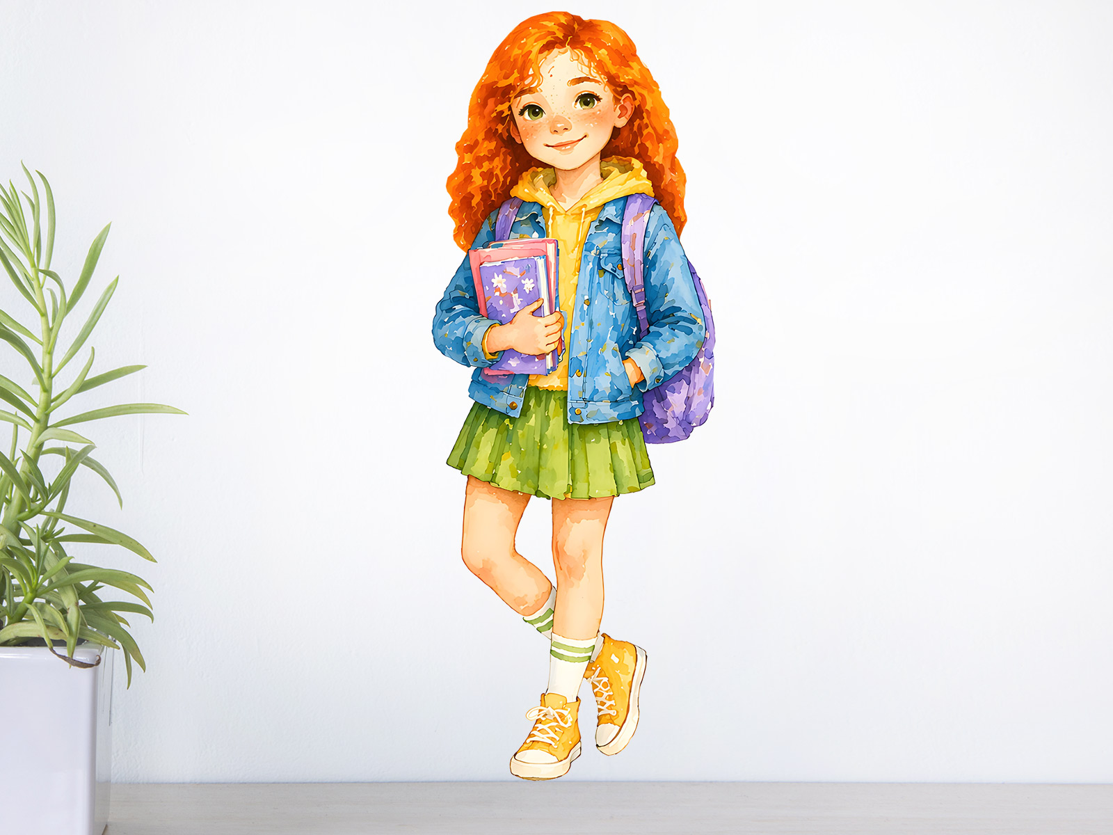 Samolepka na zeď Školačka zrzka zaujme na první pohled svými výraznými zrzavými vlasy, jemnými pihami a přátelským úsměvem. Působí živě, radostně a přináší do dětského pokoje pozitivní energii i hravou atmosféru. Akvarelové zpracování dodává ilustraci měkkost a přirozenost. Jemné barevné přechody, detailně propracované oblečení i doplňky, jako je batoh a knihy, vytváří harmonický celek, který působí útulně a esteticky čistě. Motiv je ideální do studijního koutku, nad psací stůl nebo na zeď v dětském pokoji, kde může sloužit jako milá motivace ke školním aktivitám i tvořivosti. Skvělá volba pro malé školačky, které mají rády jemný styl, barvy a inspirativní prostředí kolem sebe.