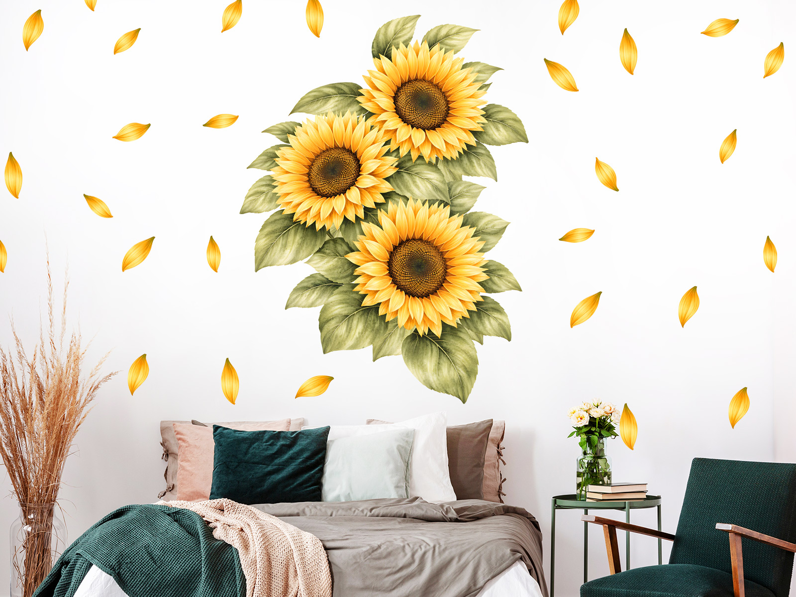 Samolepka na zeď Slunečnice vnese do interiéru hřejivou atmosféru, radost a energii slunečných dnů. Výrazná kompozice žlutých květů působí pozitivně a okamžitě rozjasní každý prostor. Akvarelové zpracování zvýrazňuje detailní strukturu okvětních lístků i přirozené odstíny zelených listů. Jemně rozptýlené lístky kolem hlavního motivu dodávají celé dekoraci lehkost a dynamiku. Díky centrálnímu uspořádání květin vzniká elegantní dominantní prvek, který se skvěle hodí například nad postel, pohovku nebo komodu. Samolepka se hodí do ložnice, obývacího pokoje i dalších místností, kde chcete vytvořit příjemnou a útulnou atmosféru. Ideální volba pro ty, kteří chtějí svému domovu dodat optimismus, svěžest a nádech letní přírody.