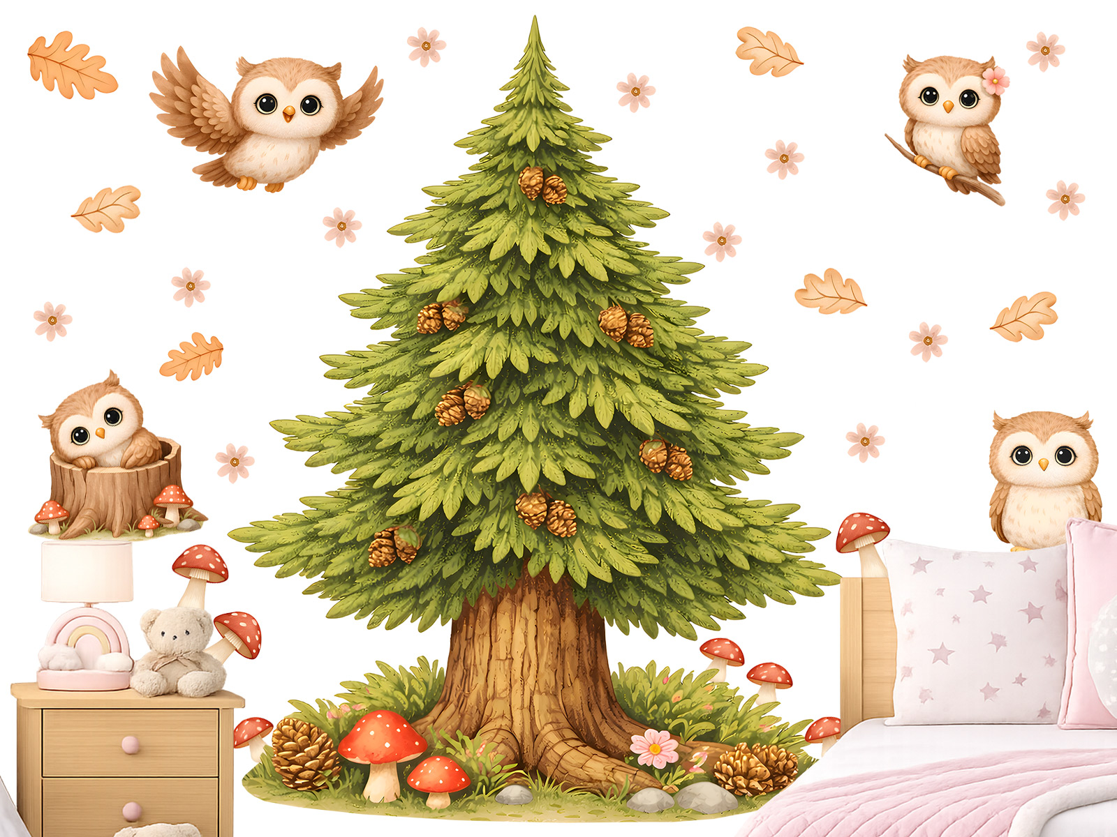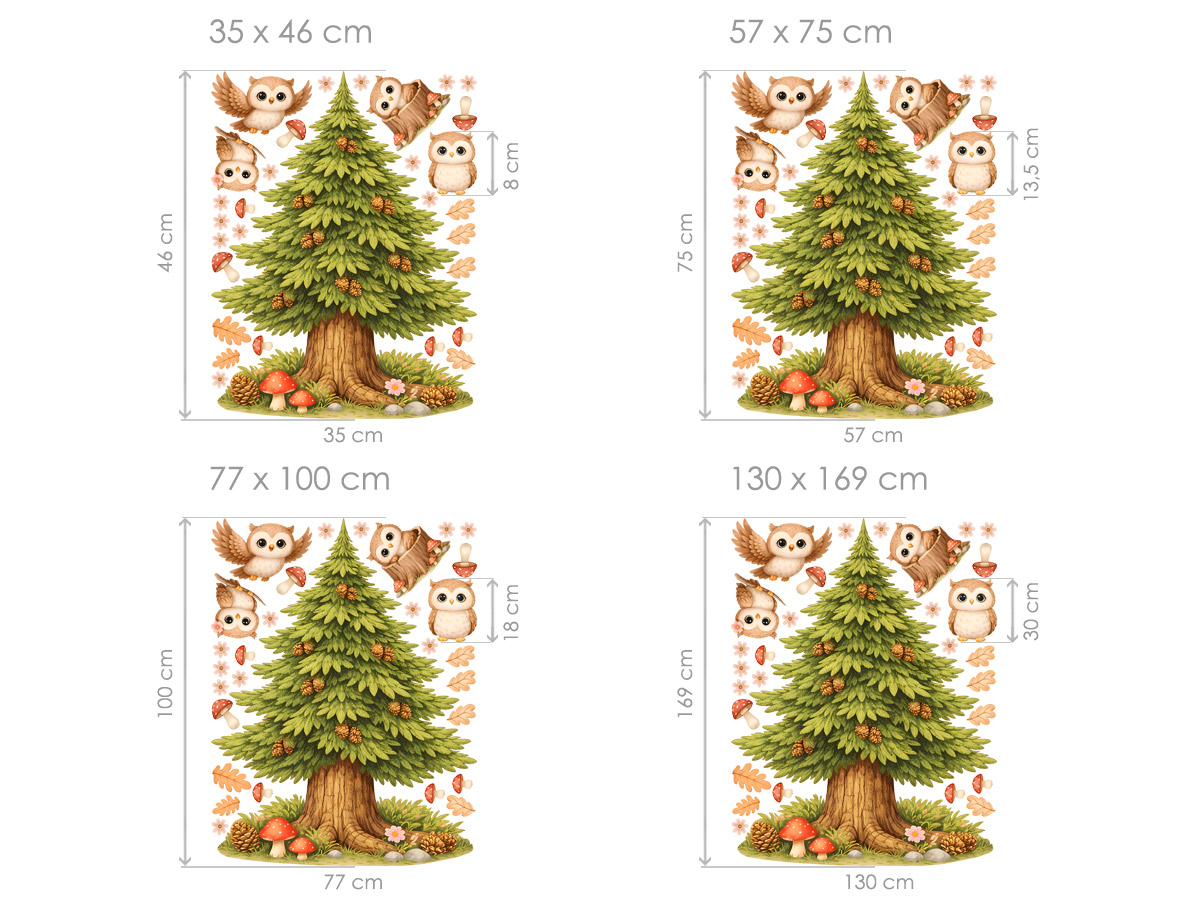 Samolepka na zeď Smrk a sovičky přináší do dětského pokoje kouzlo lesní přírody v jemném a hravém pojetí. Dominantní jehličnatý strom doplňují roztomilé sovičky, které působí mile a vytvářejí příjemnou, uklidňující atmosféru. Detailně zpracovaný smrk se šiškami spolu s drobnými prvky jako jsou houbičky, kvítky a padající lístky vytváří harmonickou kompozici inspirovanou lesem. Přírodní barevnost v odstínech zelené, hnědé a jemně oranžové krásně zapadne do dětského interiéru a navodí pocit útulnosti. Díky samostatným prvkům si můžete sovičky i doplňky rozmístit podle vlastních představ a přizpůsobit tak dekoraci konkrétnímu prostoru – nad postel, ke komodě nebo na celou stěnu. Ideální dekorace pro děti, které mají rády zvířátka a klidnou atmosféru lesa.