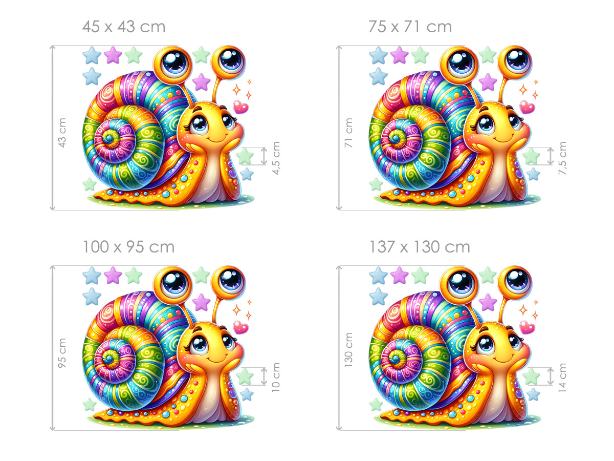 Tyto samolepky na zeď jsou ideální do dětského pokoje, herny nebo koutku na hraní. Díky pestrým barvám krásně oživí interiér a mohou se stát hlavní dekorací celé stěny. Šneček skvěle ladí s dalšími dětskými motivy, jako jsou hvězdičky, mraky nebo zvířátka, a pomůže vytvořit hravé a fantazijní prostředí.