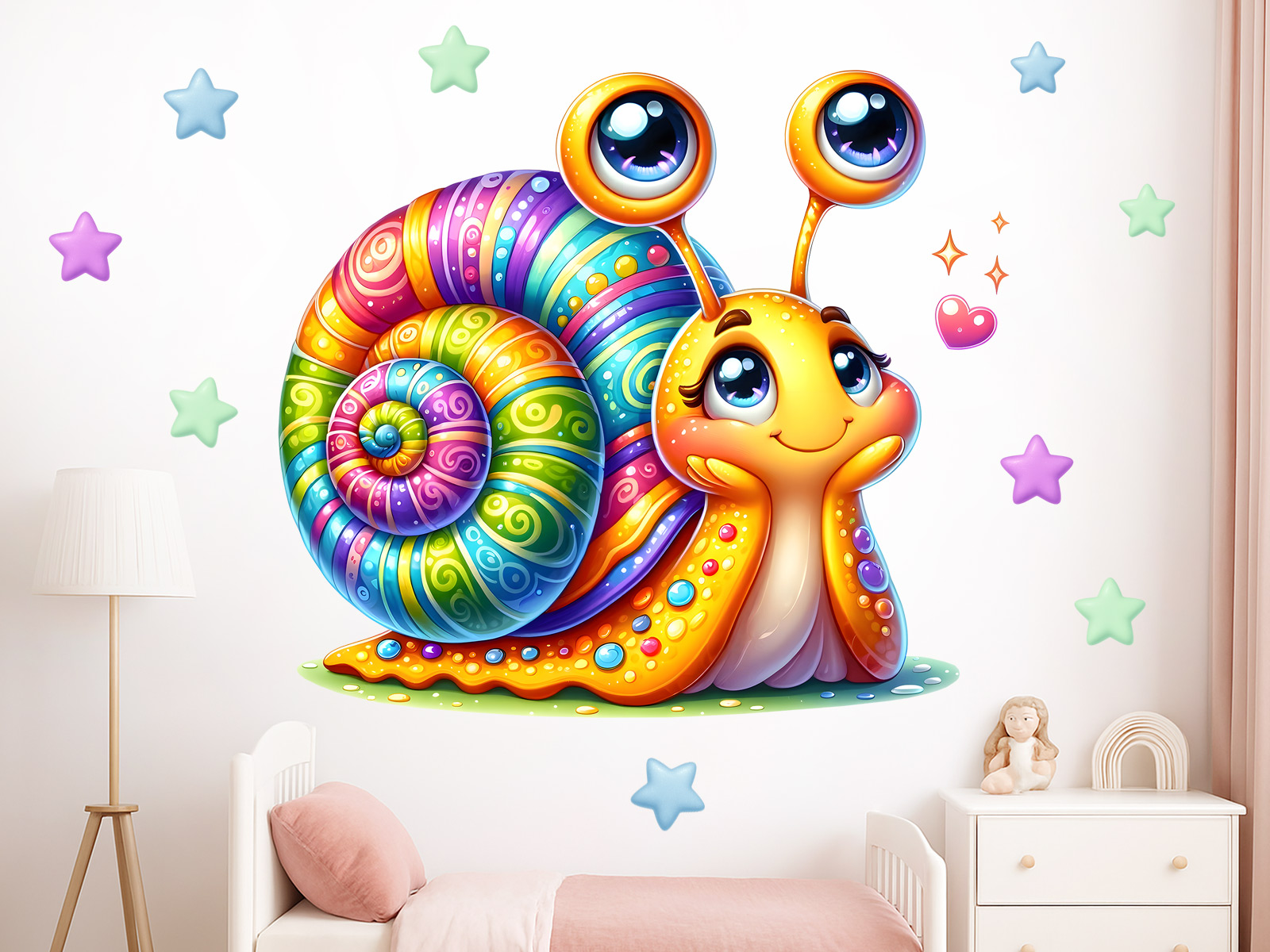 Samolepka na zeď s roztomilým šnečkem je veselou a hravou dekorací, která rozzáří každý dětský pokoj. Barevná ulita plná duhových odstínů a jemných vzorů vytváří na stěně výrazný a zároveň velmi přátelský motiv. Velké třpytivé oči a milý úsměv dodávají šnečkovi pohádkový vzhled, který děti okamžitě zaujme a vytvoří v pokoji radostnou atmosféru.