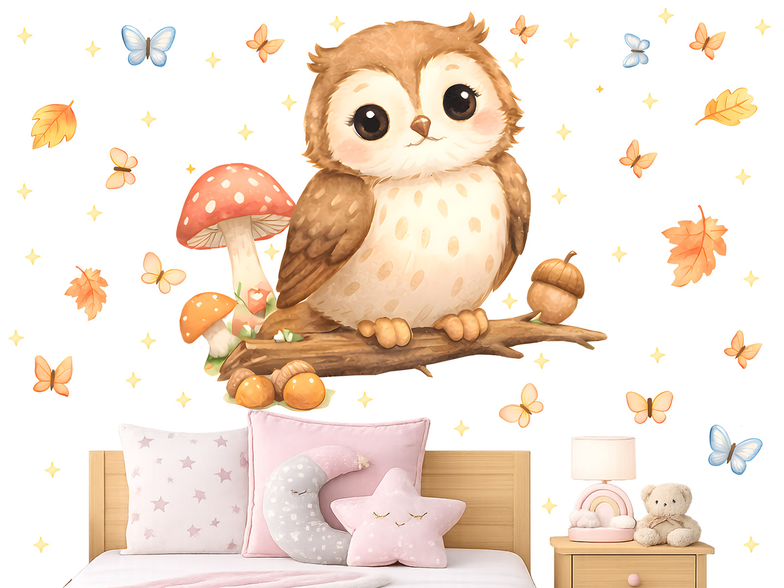 Něžná samolepka se sovou z lesa vnese do dětského pokoje klidnou, pohádkovou atmosféru plnou lesních kouzel. Roztomilá sovička sedící na větvi, obklopená podzimním listím, houbami a motýlky, působí mile a bezpečně a podporuje pocit pohody před usínáním. Jemné pastelové barvy a akvarelový styl se snadno sladí s ostatními dekoracemi v dětském pokoji a hodí se jak pro holčičky, tak pro chlapečky. Samolepka krásně oživí prostor nad postýlkou, postelí nebo hracím koutkem a promění stěnu v tichý lesní příběh plný fantazie.