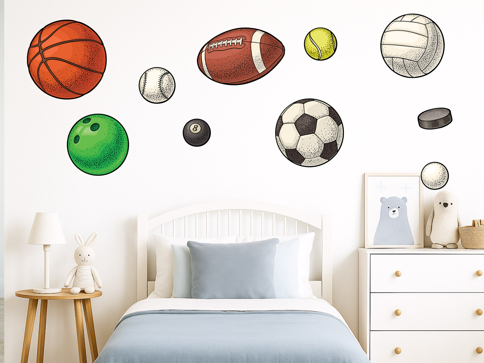 Samolepky na zeď Sportovní míče jsou ideální volbou pro malé i větší sportovní nadšence. Kolekce obsahuje pestrý výběr oblíbených míčů z různých sportů – od fotbalu, basketbalu a amerického fotbalu až po tenis, baseball nebo bowling – v jednotném ilustrativním stylu, který působí hravě a zároveň přehledně. Díky samostatným motivům si lze vytvořit vlastní dynamickou kompozici přesně podle prostoru a fantazie dítěte. Samolepky krásně oživí dětský pokoj, hernu nebo sportovní koutek a podporují zájem o pohyb, soutěživost i rozmanitost sportů zábavnou a vizuálně atraktivní formou.
