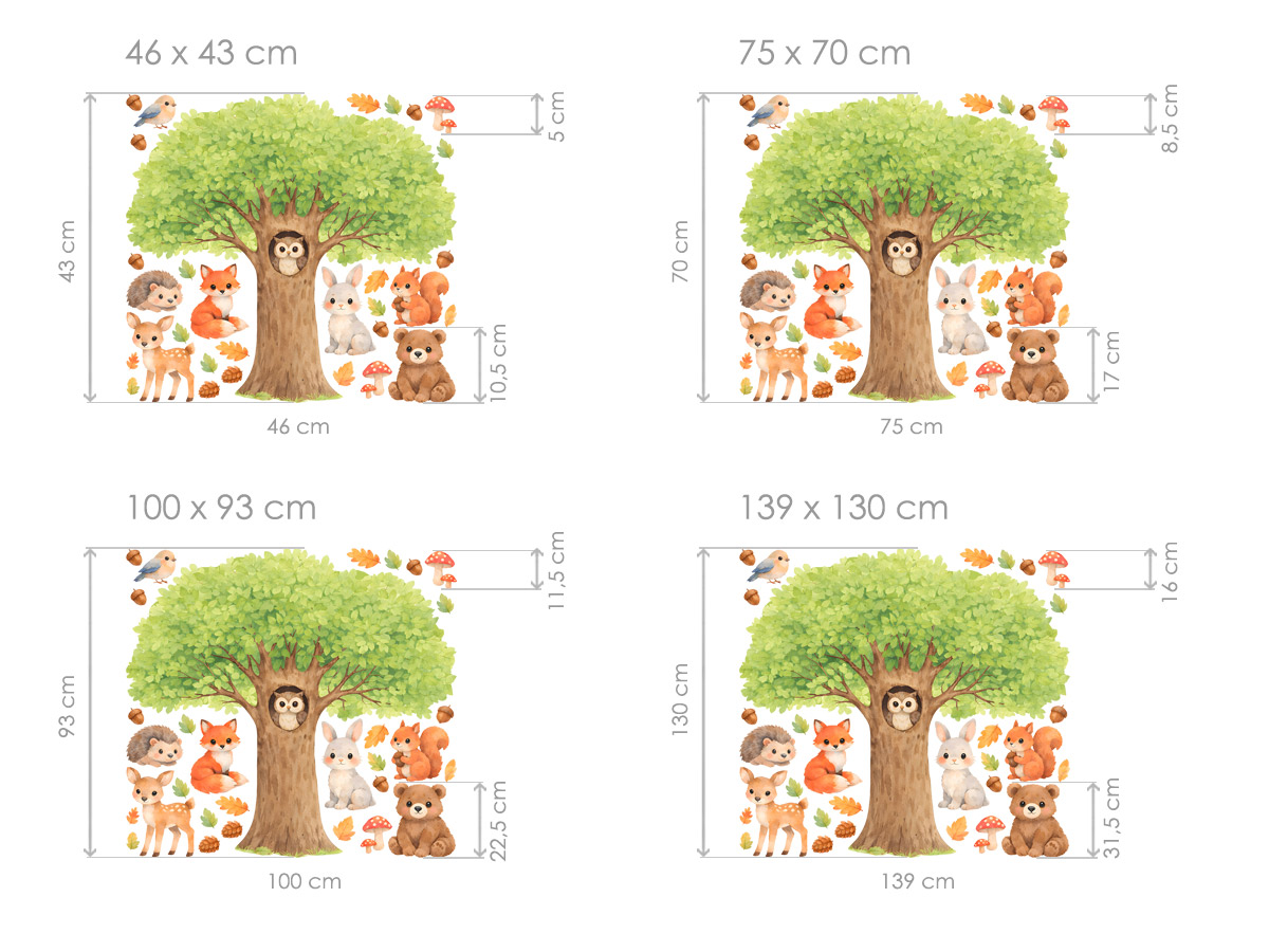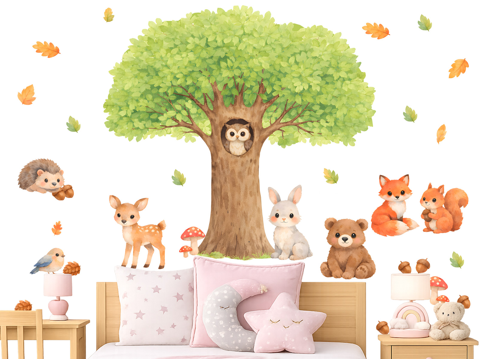 Samolepka na zeď Strom s lesními zvířátky přenese do dětského pokoje kouzelnou atmosféru lesa plného přátelských obyvatel. Dominantní strom s rozložitou korunou vytváří přirozený střed celé kompozice, kolem kterého se objevují roztomilá lesní zvířátka – liška, srneček, zajíček, medvídek, ježeček i sovička ukrytá v dutině stromu. Jemné akvarelové zpracování, hřejivé přírodní barvy a drobné detaily v podobě listů, hub a žaludů působí klidně, harmonicky a podporují fantazii i pocit bezpečí. Díky rozložení jednotlivých motivů si můžete vytvořit vlastní lesní scénu přesně podle prostoru a proměnit dětský pokoj v místo, kde se každý den odehrávají tiché pohádky z lesa.