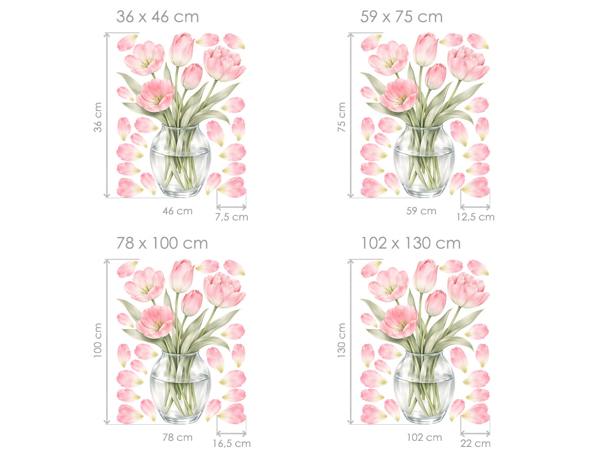 Samolepka na zeď Tulipány ve váze přináší do interiéru pocit svěžesti, čistoty a přirozené elegance. Jemná kompozice růžových tulipánů ve skleněné váze působí velmi realisticky a zároveň lehce, takže krásně oživí každý prostor. Detailní akvarelové zpracování zvýrazňuje průhlednost vázy, jemné stonky i strukturu květů. Poletující okvětní lístky dodávají celé dekoraci vzdušnost a navozují dojem čerstvě naaranžované květiny. Díky této samolepce vytvoříte efekt stylové dekorace bez nutnosti údržby živých květin. Skvěle se hodí do kuchyně, jídelny, obývacího pokoje i dalších místností, kde chcete dodat prostoru svěží a útulnou atmosféru. Ideální volba pro milovníky květin, kteří ocení jemný, moderní a nadčasový design.
