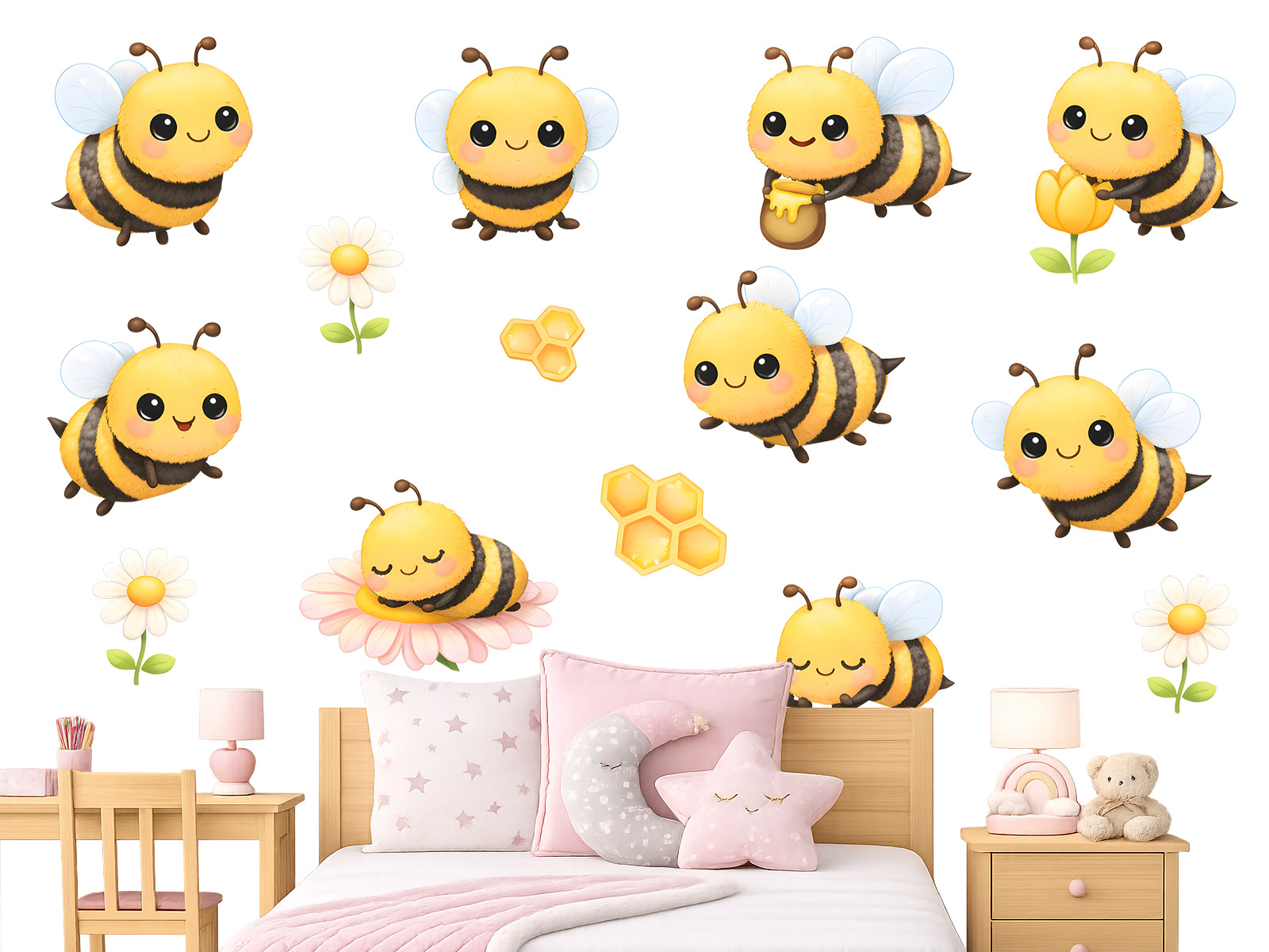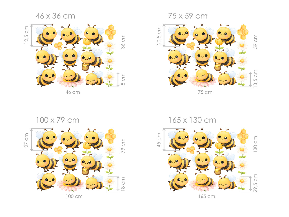 Roztomilé nástěnné samolepky s motivem veselých včelek promění dětský pokoj v něžný svět plný klidu, radosti a jemné fantazie. Hebké akvarelové barvy působí hřejivě a uklidňujícím dojmem, takže vytvářejí příjemné místo pro usínání, hraní i první dětské sny. Usměvavé včelky poletující mezi květinami a medovými plástvičkami přinášejí do prostoru pocit bezpečí, něhy a bezstarostného dětství. Celá kompozice je navržena tak, aby probouzela dětskou představivost a naplnila pokoj laskavou atmosférou, ve které se bude vaše dítě cítit šťastně každý den. Tento kouzelný motiv je jako tichá pohádka na zdi – jemná, milá a plná malých radostí.