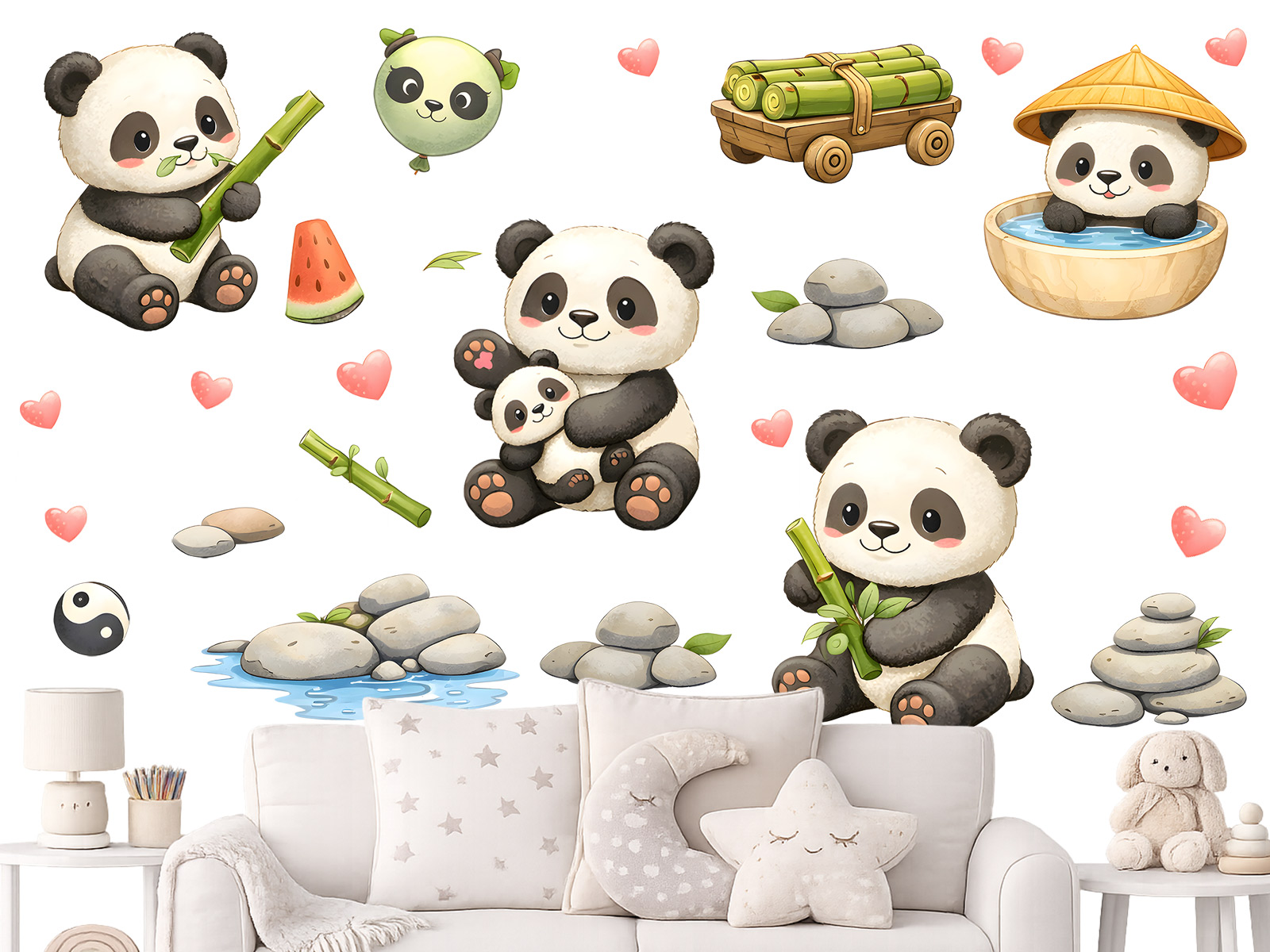 Roztomilé samolepky Veselé pandy přinesou do dětského pokoje jemnou hravost, klidnou atmosféru a radostnou náladu inspirovanou přírodou. Sada obsahuje několik milých pand v různých pozicích doplněných o bambus, kamínky, srdíčka i drobné dekorativní prvky, které společně vytvářejí harmonickou kompozici vhodnou nad postýlku, komodu nebo hrací koutek. Díky něžným barvám a přátelskému výrazu působí motiv uklidňujícím dojmem a hodí se pro miminka i větší děti. Samolepky se snadno aplikují na zeď a umožňují vytvořit útulný prostor plný fantazie, pohody a dětské radosti bez složitého zdobení interiéru.