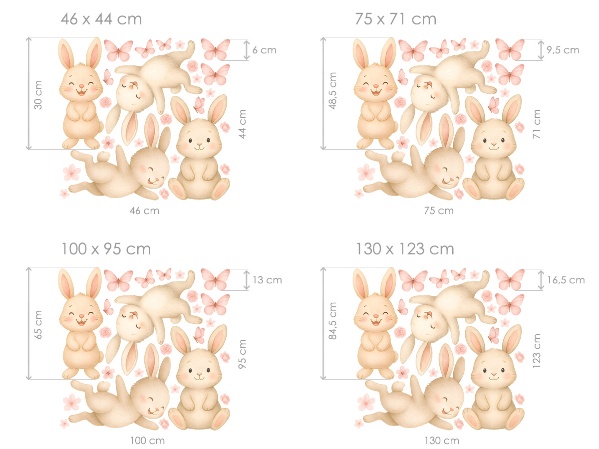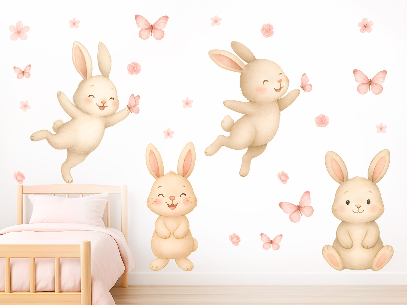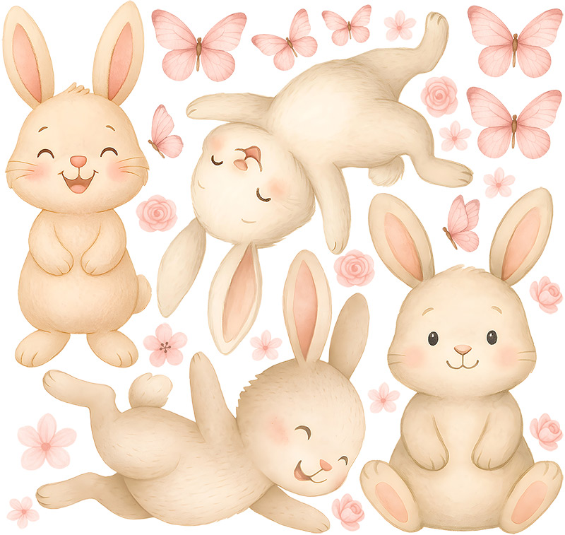 Samolepka na zeď „Veselí zajíčci“ přináší do dětského pokojíčku radost, lehkost a hravou energii díky čtveřici roztomilých králíčků, kteří skáčou, smějí se a dovádějí mezi jemnými motýlky a kvítky. Každý zajíček má svůj vlastní výraz i pózu, takže celek působí živě a přirozeně, jako by se malí chlupatí kamarádi právě přiřítili do místnosti. Jemné pastelové barvy, měkké stínování a pohádkový akvarelový styl vytvářejí uklidňující atmosféru, která krásně doplní postýlku, hrací kout nebo čtecí koutek. Tento hravý motiv je ideální volbou pro všechny, kteří chtějí dopřát dětem prostředí plné fantazie, něžnosti a příjemné hravosti.