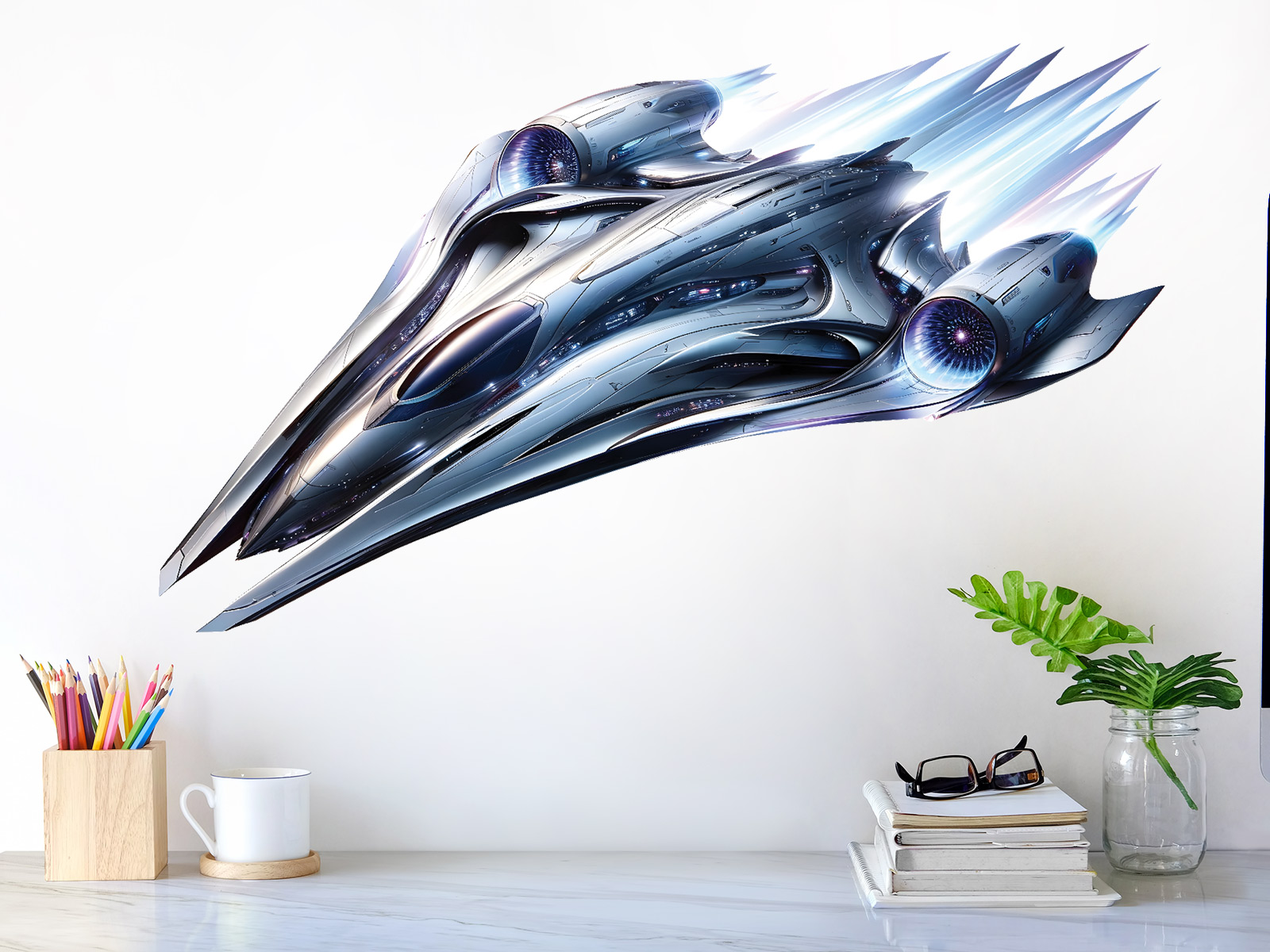 Samolepka na zeď Vesmírná loď přenese dětský pokoj do světa futuristických dobrodružství a nekonečného vesmíru. Dynamický design elegantní kosmické lodi v pohybu působí rychle, odvážně a technicky propracovaně, jako by právě prolétala galaxií vysokou rychlostí. Kovové odstíny, jemné světelné efekty a plynulé linie dodávají motivu hloubku a moderní výraz, který zaujme malé i větší objevitele. Ilustrace podporuje představivost, chuť objevovat neznámé světy a snít o dalekých planetách, přičemž se stává výrazným vizuálním prvkem interiéru. Vesmírná loď je ideální volbou pro děti, které milují vesmír, techniku a příběhy o cestách za hranice známého světa.