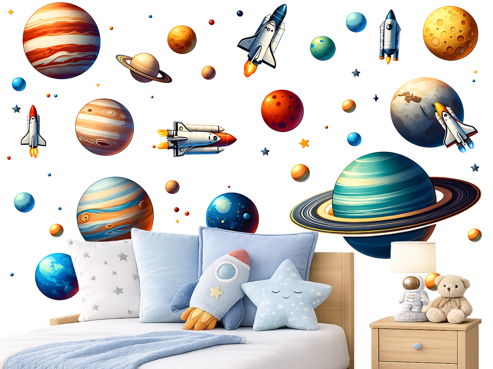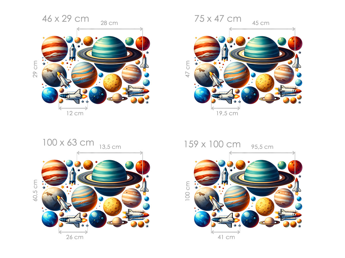 Samolepka na zeď „Vesmírné raketky“ přenese dětský pokoj do barevného světa planet, raket a objevování nekonečného vesmíru. Dynamická kompozice plná různě velkých planet, kosmických lodí a drobných hvězd působí hravě, ale zároveň harmonicky, takže se snadno přizpůsobí jak menším, tak větším prostorům. Jednotlivé motivy umožňují vytvořit vlastní rozložení na zdi – od výrazné centrální scény až po lehce rozptýlený vesmírný motiv po celé místnosti. Ilustrace jsou detailní, barevně vyvážené a působí moderně i nadčasově, díky čemuž samolepka skvěle doplní pokoj malých milovníků raket, planet a vesmírných dobrodružství.