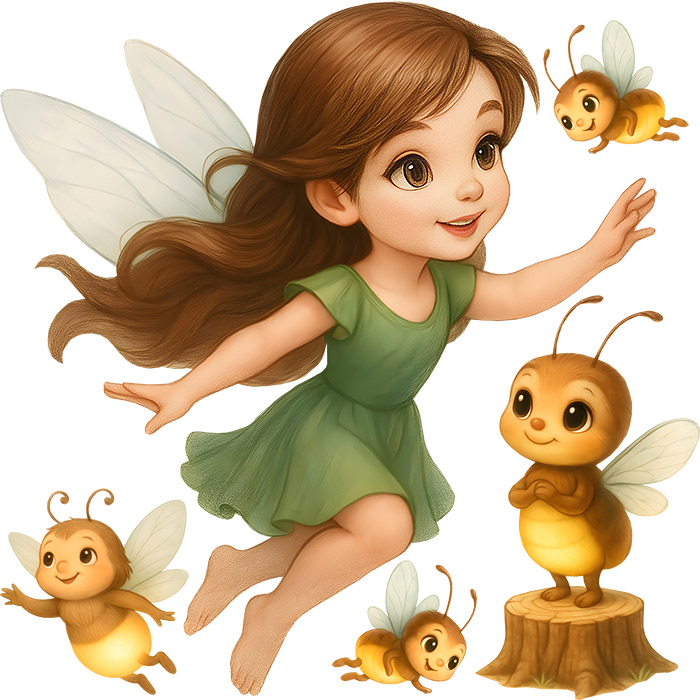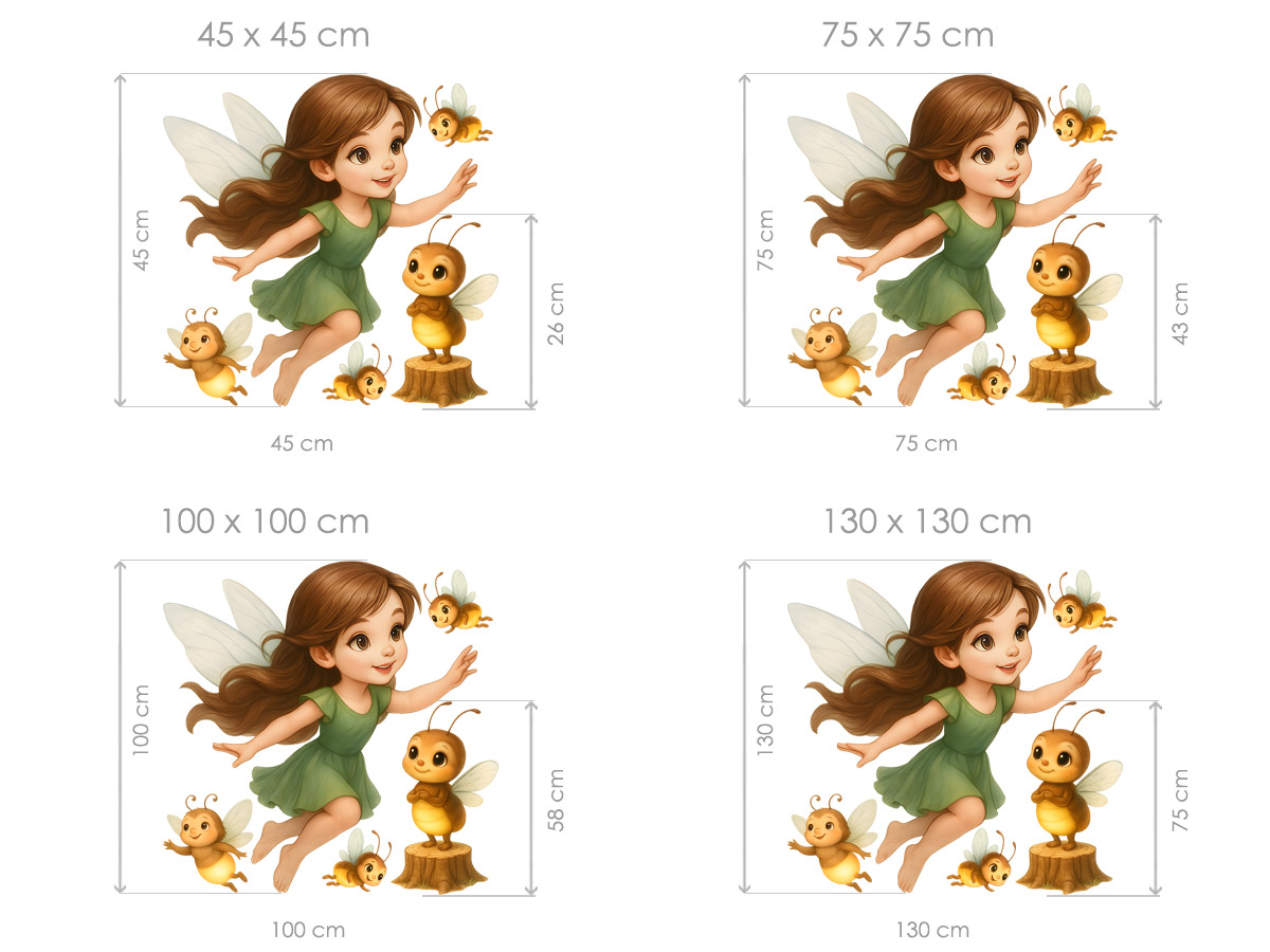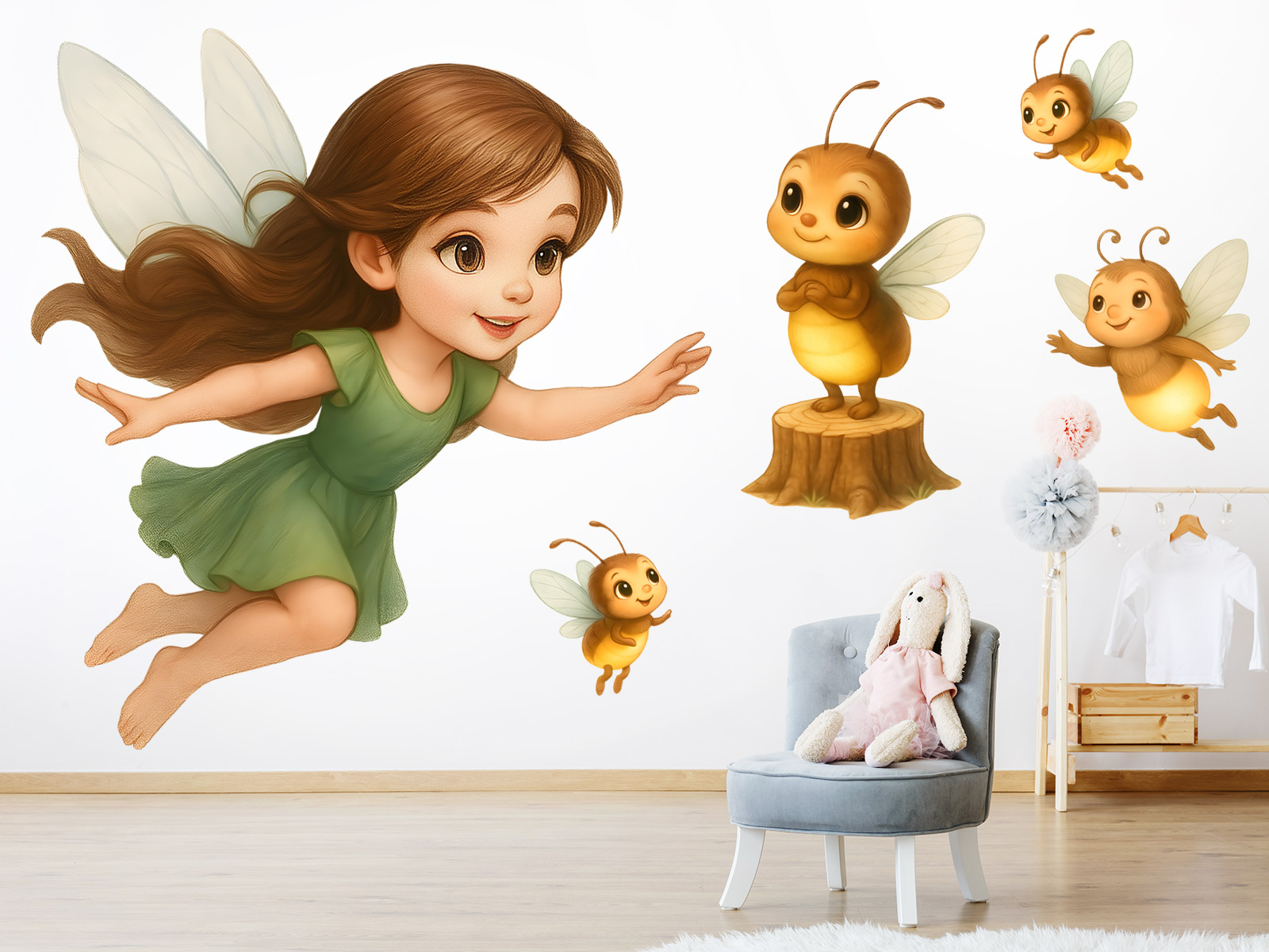 Samolepka na zeď „Víla a světlušky“ promění každý dětský pokoj v jemný, kouzelný svět plný fantazie a světélkující radosti. Hlavním motivem je něžná víla s vlajícími vlásky a jemnými křídly, která působí, jako by se právě vznesla ze stránky oblíbené pohádky. Doprovází ji roztomilé světlušky – každá s vlastním výrazem a hravým pohybem – včetně jedné stojící na pařezu, která celému výjevu dodává příběhovou atmosféru. Díky archu s jednotlivými prvky můžete vše kreativně rozmístit přesně podle volného prostoru a vlastního vkusu. Můžete také zvolit libovolnou velikost archu. Díky jemným barvám, měkkému ilustrátorskému stylu a čistému bílému pozadí se motiv dokonale hodí jak do dívčích pokojíčků, tak i do školek, kam přinese pocit lehkosti, radosti a pohádkového dobrodružství.