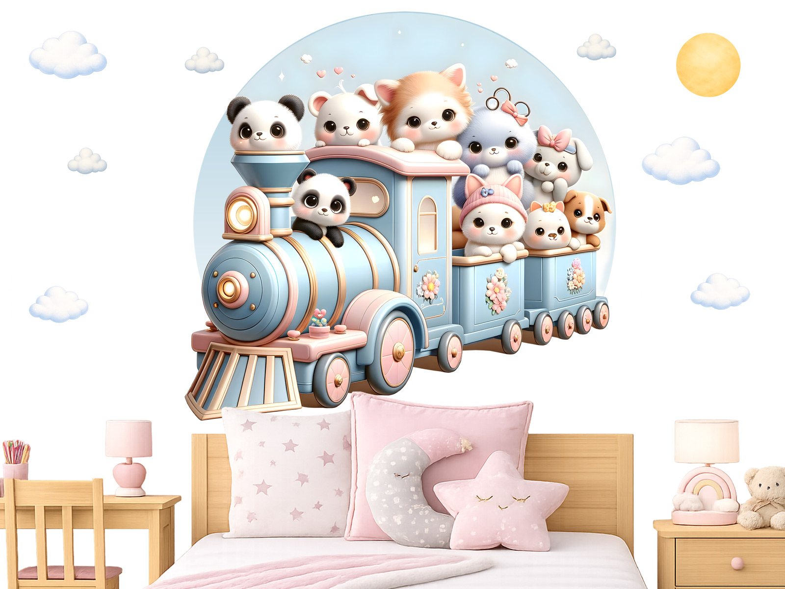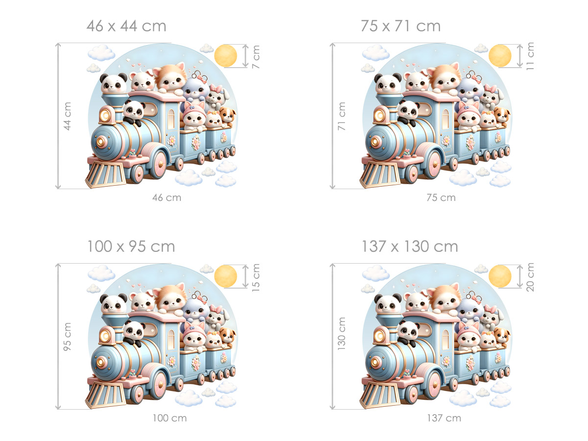 Vláček plný zvířátek přináší do dětského pokoje radostnou atmosféru plnou hravosti a fantazie. Roztomilá zvířátka vykukující z barevných vagónků vytvářejí veselý motiv, který podněcuje dětskou představivost a zve k vymýšlení nových příběhů o dobrodružných cestách. Jemné pastelové barvy působí harmonicky a klidně, takže motiv krásně doplní prostor určený ke hře i odpočinku. Vláček se zvířátky se snadno stane oblíbenou součástí pokoje, kde každý den může začínat nová pohádková jízda plná úsměvů a dětské radosti.