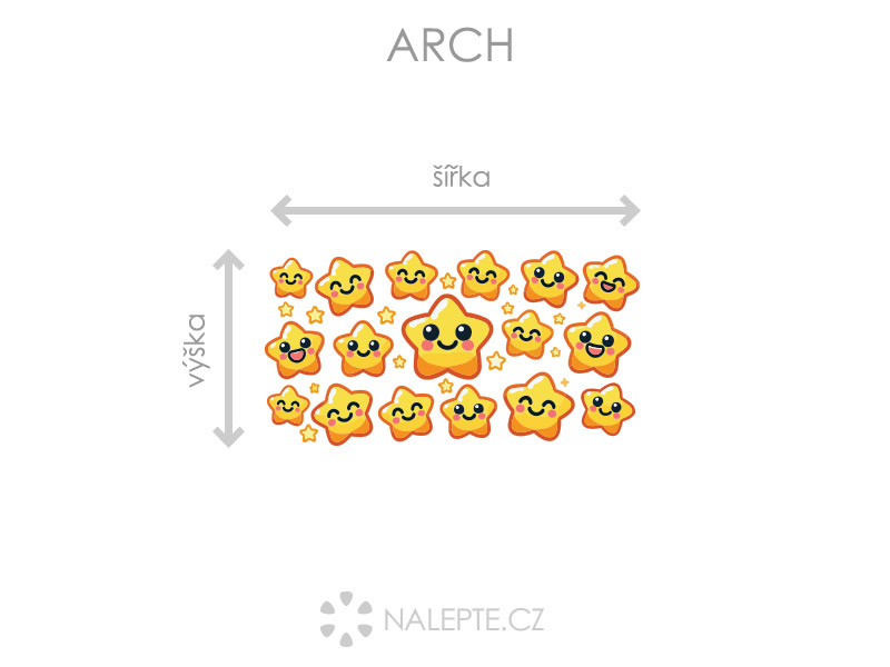 Arch = takto vám bude samolepka doručena. Každý prvek na archu je samostatná samolepka, jednotlivé části jednoduše od papírového podkladu odlepíte a nalepíte na zeď tak, aby složily výsledný motiv dle Vašich představ. Arch si můžete prohlédnout ve fotogalerii. Rozměr archu volíte v objednávce. Přehled předdefinovaných rozměrů (šířka x výška): a) arch 45 x 24 cm b) arch 75 x 39 cm c) arch 100 x 52 cm d) arch 130 x 68 cm Je možné zvolit i libovolný vlastní rozměr archu pomocí posuvníku či klikání na "Větší", "Menší"