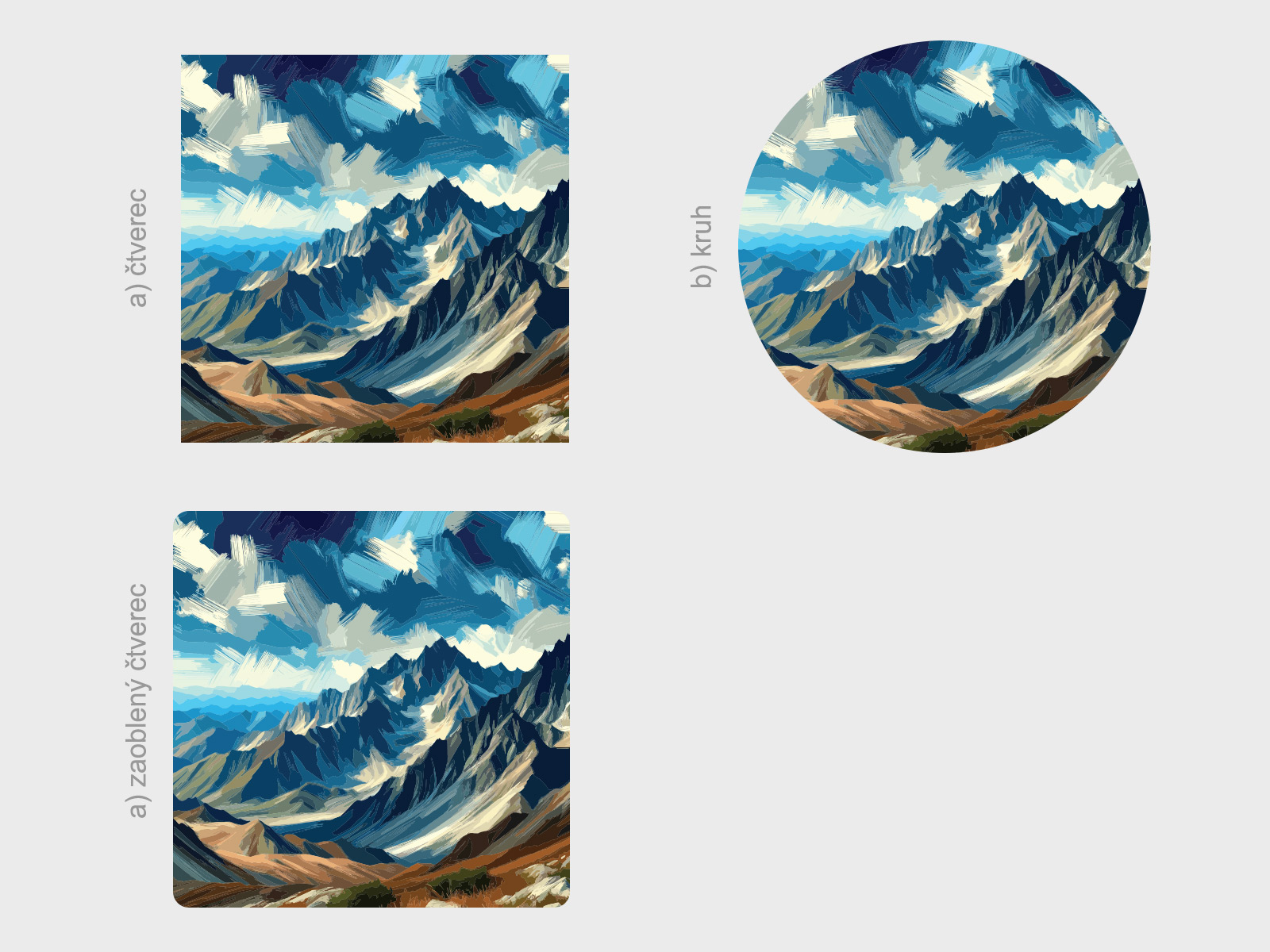 Tvar je možné změnit. Lze vybrat a) čtverec, b) kruh, c) zaoblený čtverec viz fotogalerie. Pokud tedy máte zájem o jiný tvar než na hlavní fotografii, stačí v posledním kroku objednávky do pole poznámka napsat např. "kruh". Jedná se o tištěný samolepící plakát - imitace malby Je možné zvolit i libovolný vlastní rozměr archu pomocí posuvníku či klikání na "Větší", "Menší"