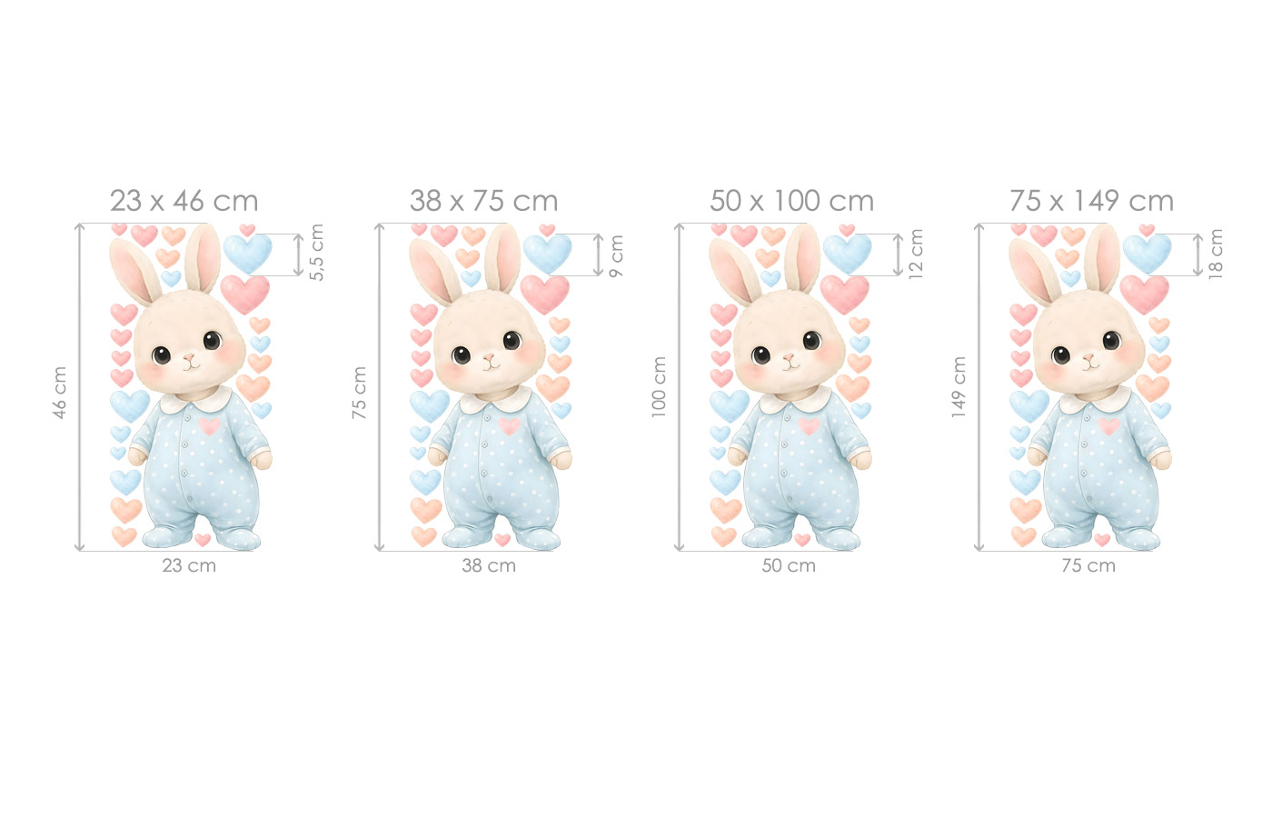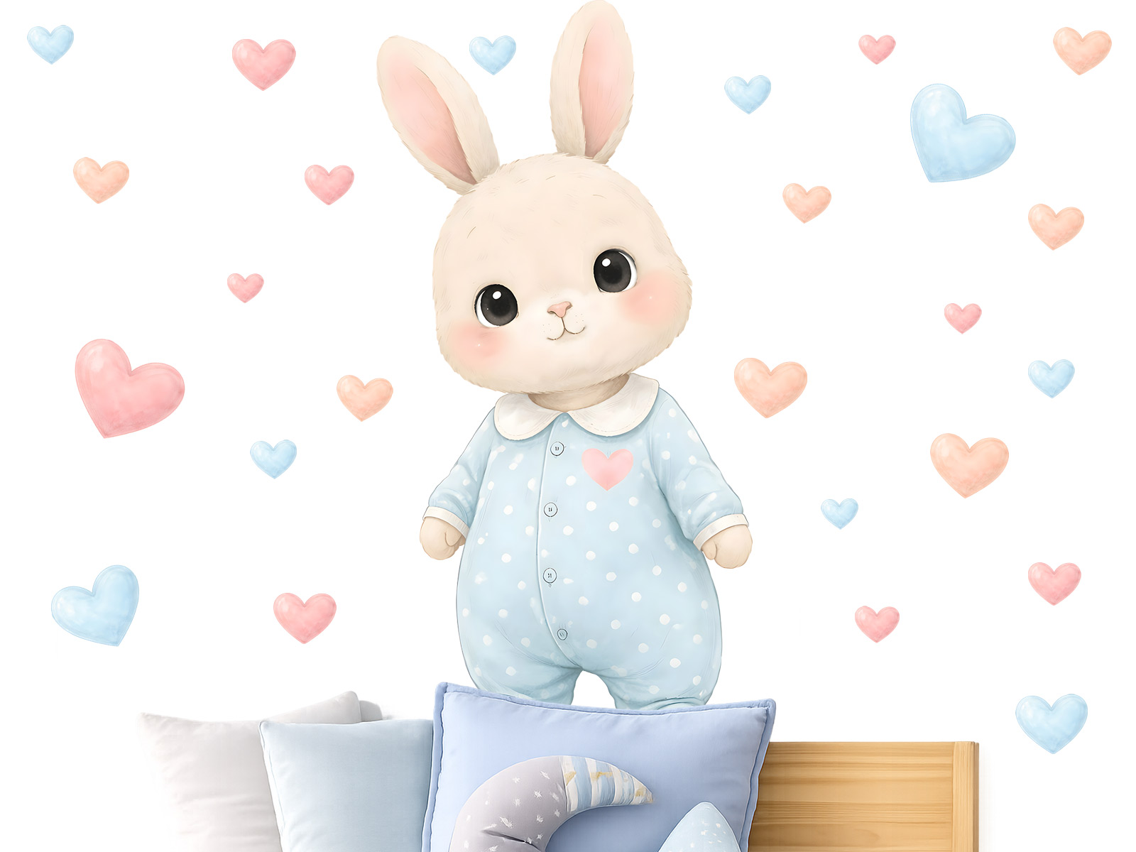 Samolepky na zeď Mimi zajíc vnášejí do dětského pokoje něžnou, klidnou a láskyplnou atmosféru. Roztomilý zajíček v jemném pyžámku, obklopený pastelovými srdíčky, působí mile, bezpečně a harmonicky, takže je ideální volbou pro miminka i malé děti. Ilustrace je laděná do jemných barev, které krásně doplní světlý interiér a vytvoří útulné prostředí podporující klid a pohodu. Samolepka se hodí nad postýlku, ke komodu nebo do hracího koutku a snadno se stane dominantním, ale zároveň nenápadným prvkem pokoje. Díky několika velikostním variantám lze motiv přizpůsobit menším i větším stěnám a vytvořit tak kouzelný dětský svět, ve kterém se děti budou cítit příjemně, v bezpečí a obklopené laskavou fantazií.