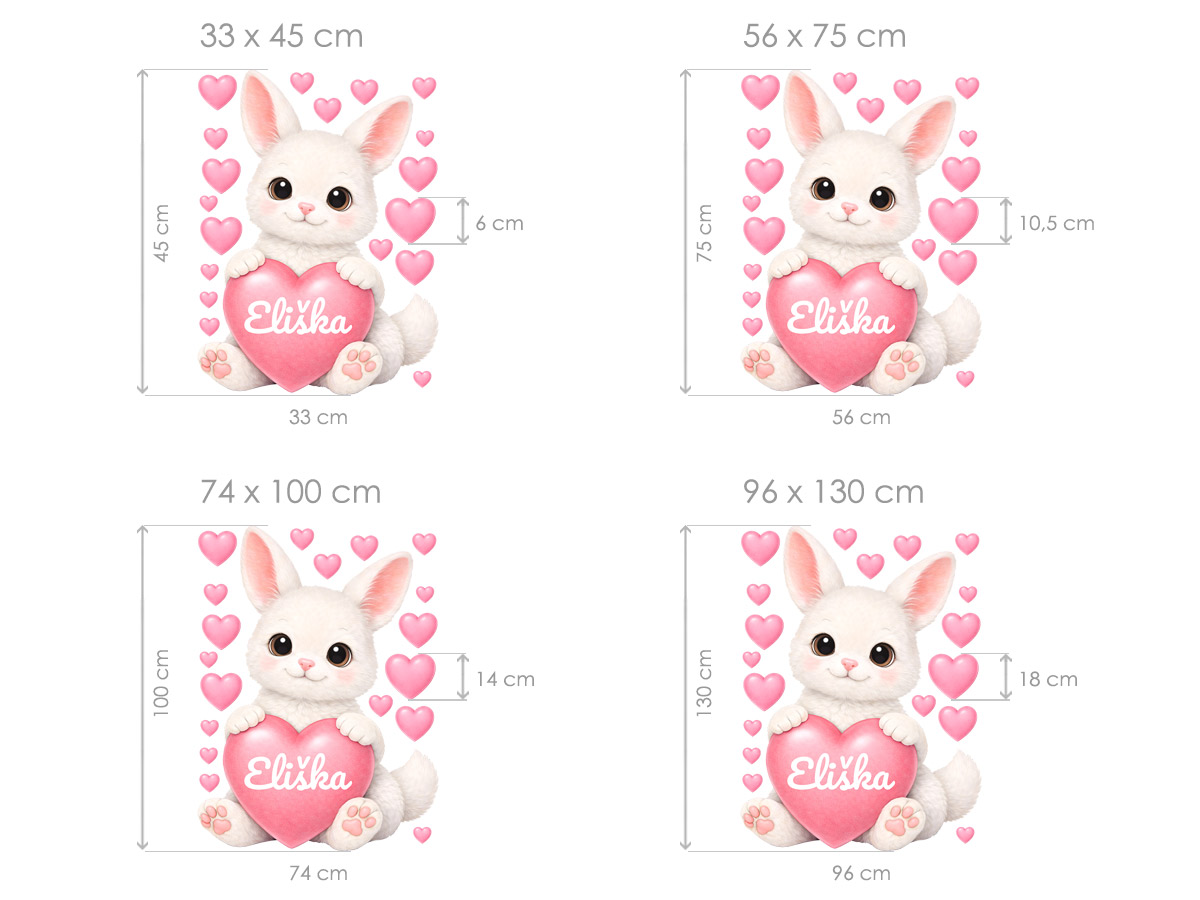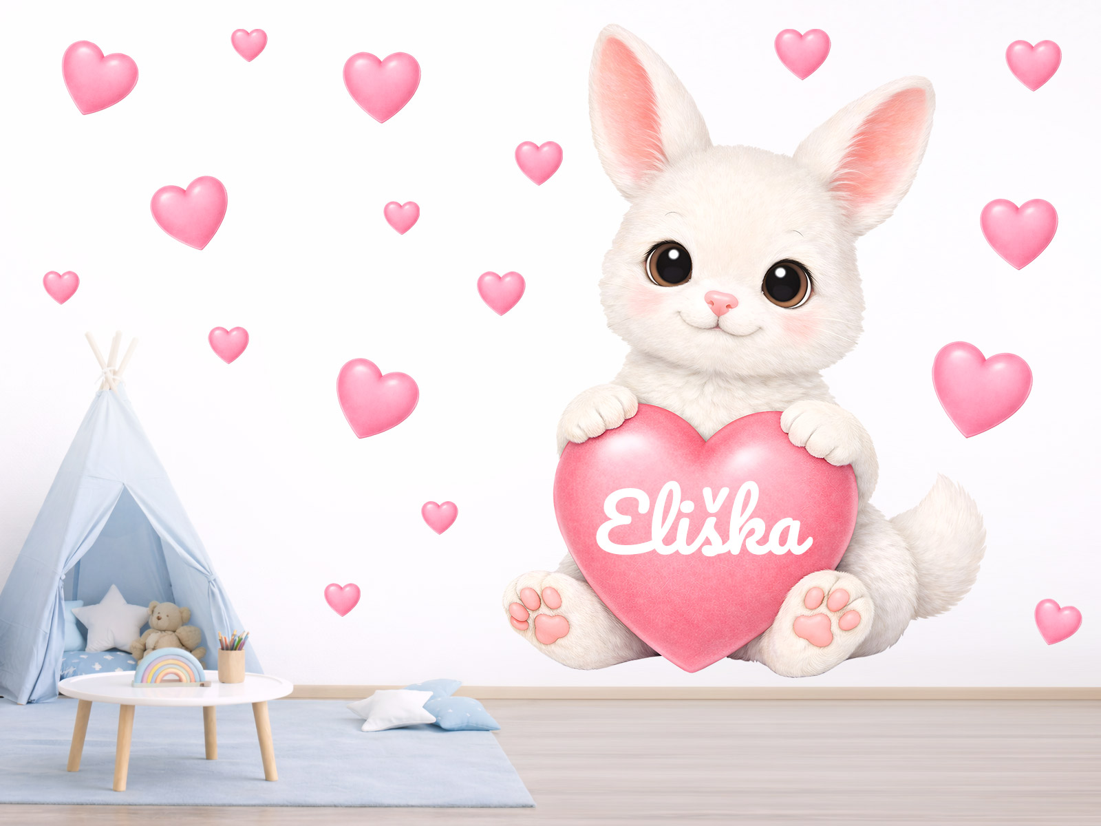 Jméno na přání v srdíčku lze samotné nebo kombinovat s datem narození nebo například věkem (tento údaj bude vycentrován pod jménem ve druhém řádku). Text zadejte ve 3. kroku objednávky do pole "poznámka". Máte-li speciální přání kontaktujte nás: info@nalepte.cz. Bude Vám zaslán náhled ke schválení emailem. Samolepka na zeď Zajíček se srdíčkem a jménem vnese do dětského pokoje něžnou, láskyplnou atmosféru plnou radosti a osobního kouzla. Roztomilý bílý zajíček s velkýma očima objímající růžové srdíčko působí mile a uklidňujícím dojmem, zatímco drobná srdíčka kolem vytvářejí hravou a hřejivou náladu. Motiv je navržen tak, aby se stal jedinečnou součástí dětského světa – jméno na srdíčku dodává dekoraci osobní rozměr a vytváří silné citové pouto mezi dítětem a obrázkem. Jemné pastelové barvy, hebký vzhled srsti a měkké tvary se krásně hodí do pokojíčku pro miminka i větší děti a snadno zapadnou do jemně růžových, neutrálních i světlých interiérů. Zákazník obdrží arch s hlavním motivem zajíčka doplněným o samostatná srdíčka, díky nimž lze vytvořit harmonickou a hravou kompozici podle vlastní představy. Celý design působí něžně, nadčasově a velmi mile a stane se krásným osobním doplňkem dětského pokoje.