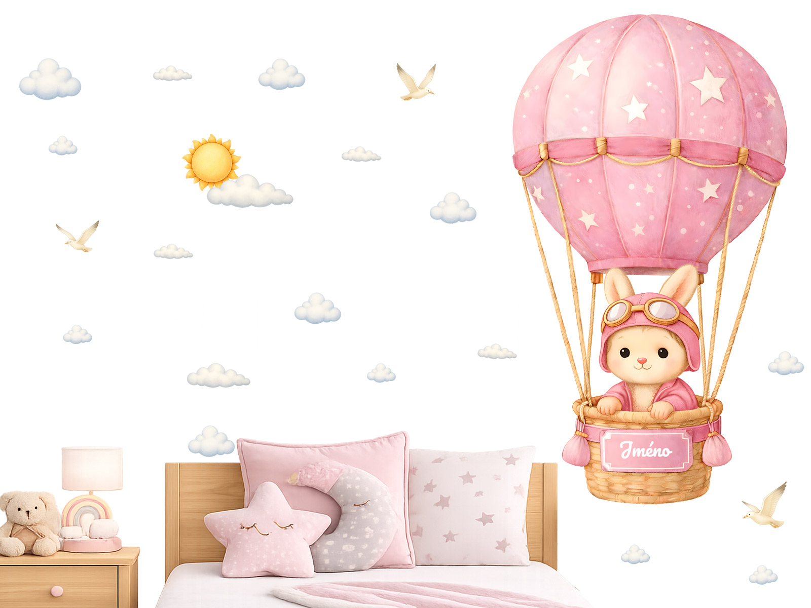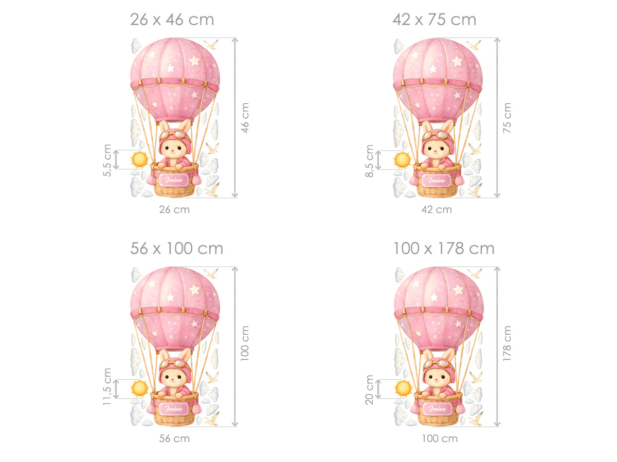 Jméno na přání na cedulce na koši létajícího horkovzdušného balónu lze s délkou do 12 znaků. Text zadejte ve 3. kroku objednávky do pole "poznámka". Máte-li speciální přání kontaktujte nás: info@nalepte.cz. Něžná samolepka se zajíčkem letícím v růžovém balónu vnese do dětského pokoje pohádkovou atmosféru plnou klidu a radosti. Jemné pastelové barvy, obláčky a drobné detaily vytvářejí hřejivý motiv, který krásně doplní interiér pro miminko i malé dítě. Díky možnosti doplnění jména se samolepka stává osobním a originálním prvkem, který potěší nejen děti, ale i rodiče. Je ideální jako dekorace nad postýlku nebo postel a zároveň jako milý dárek k narození, křtinám či narozeninám.