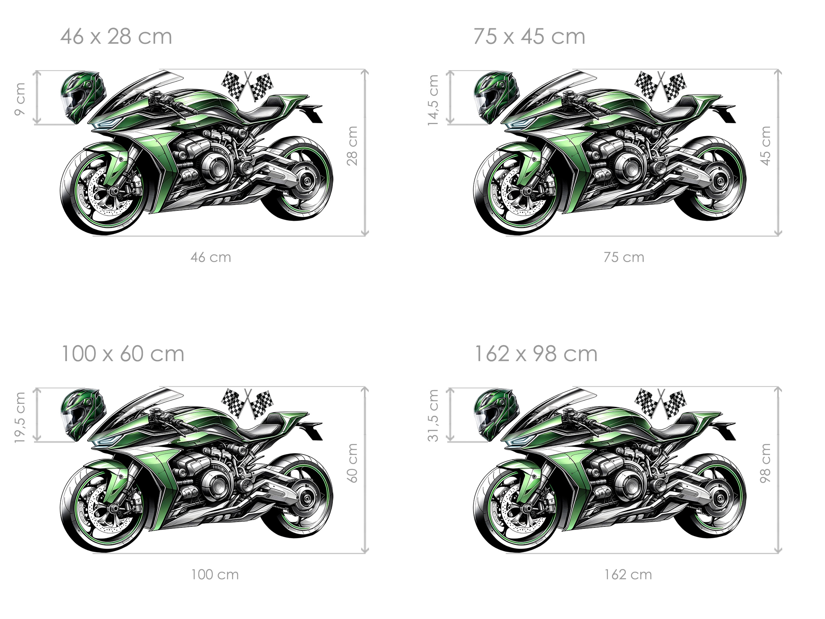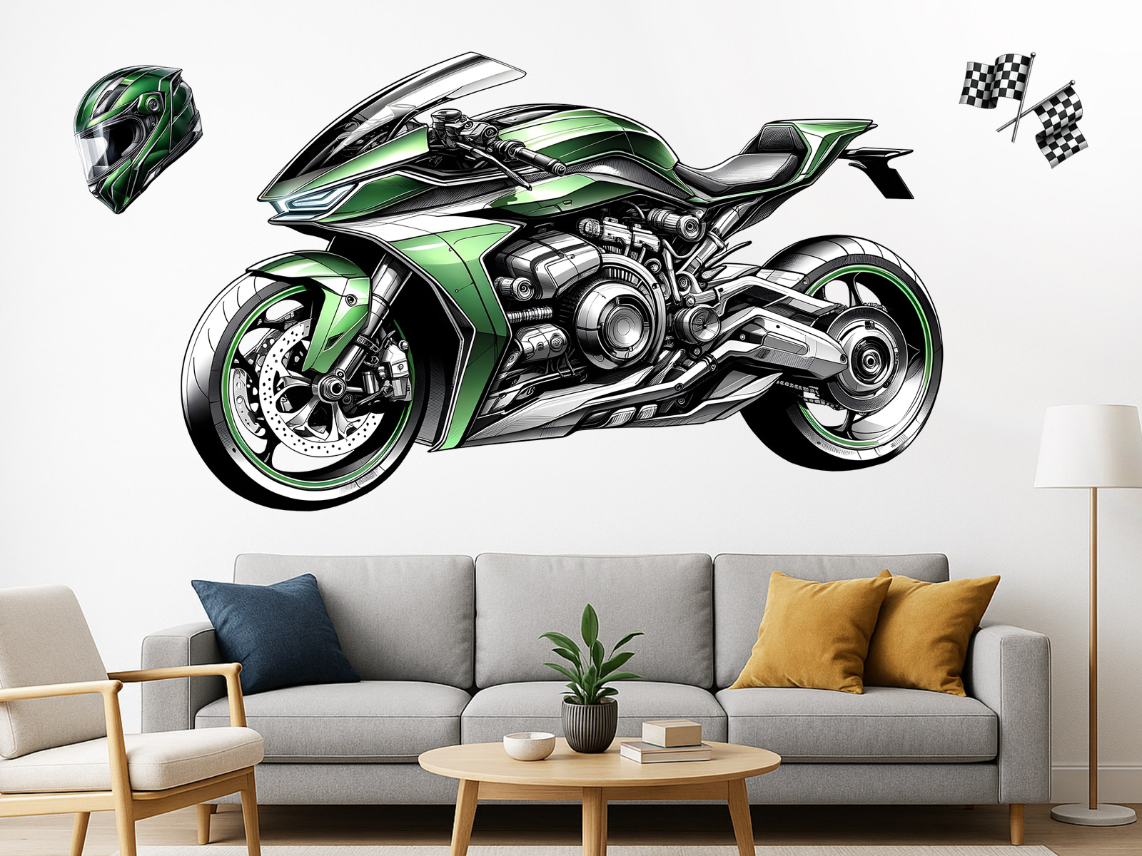 Samolepka na zeď „Zelená motorka“ je dokonalou volbou pro všechny malé i velké fanoušky rychlosti, strojů a moderního designu. Dominantou sady je precizně ilustrovaná sportovní motorka v zářivě zelené barvě, doplněná detailní přilbou a dvojicí šachovnicových vlajek, které celému motivu dodávají závodní atmosféru. Každý prvek je vytvořen ve vysoké kvalitě s ostrými liniemi, realistickým stínováním a dynamickým výrazem, díky kterému bude samolepka na zdi působit jako skutečná grafika ze závodní garáže. Motiv skvěle ozdobí dětský i teen pokoj, hernu, garáž či pracovnu a okamžitě dodá prostoru energii a styl.