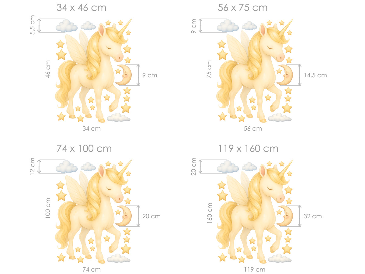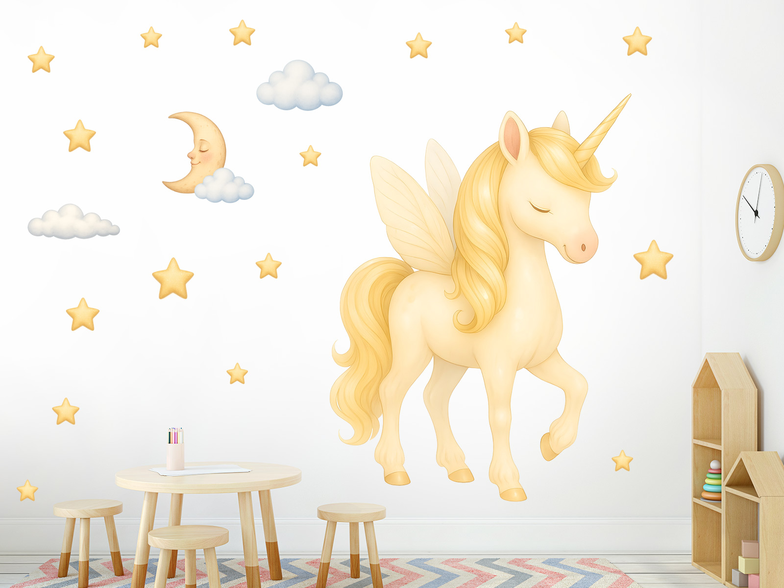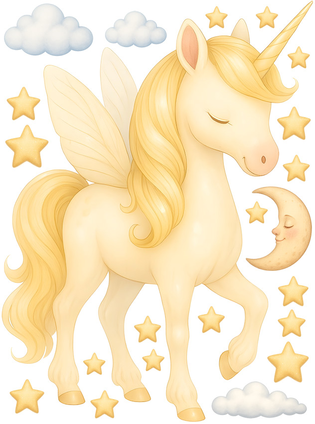 Samolepka na zeď „Zlatý jednorožec“ přináší do dětského pokoje kouzelnou atmosféru snů a jemného světla. Elegantní jednorožec se zlatavou hřívou, lesklým rohem a něžnými křídly působí jako strážce klidných snů. Celou sadu doplňují hvězdičky, měsíček a obláčky v teplých pastelových odstínech, které dohromady tvoří harmonickou a uklidňující kompozici. Ideální pro ozdobení dětského koutku, ložnice nebo herny, kde vytvoří kouzelný svět plný fantazie a jemného zlatého lesku.