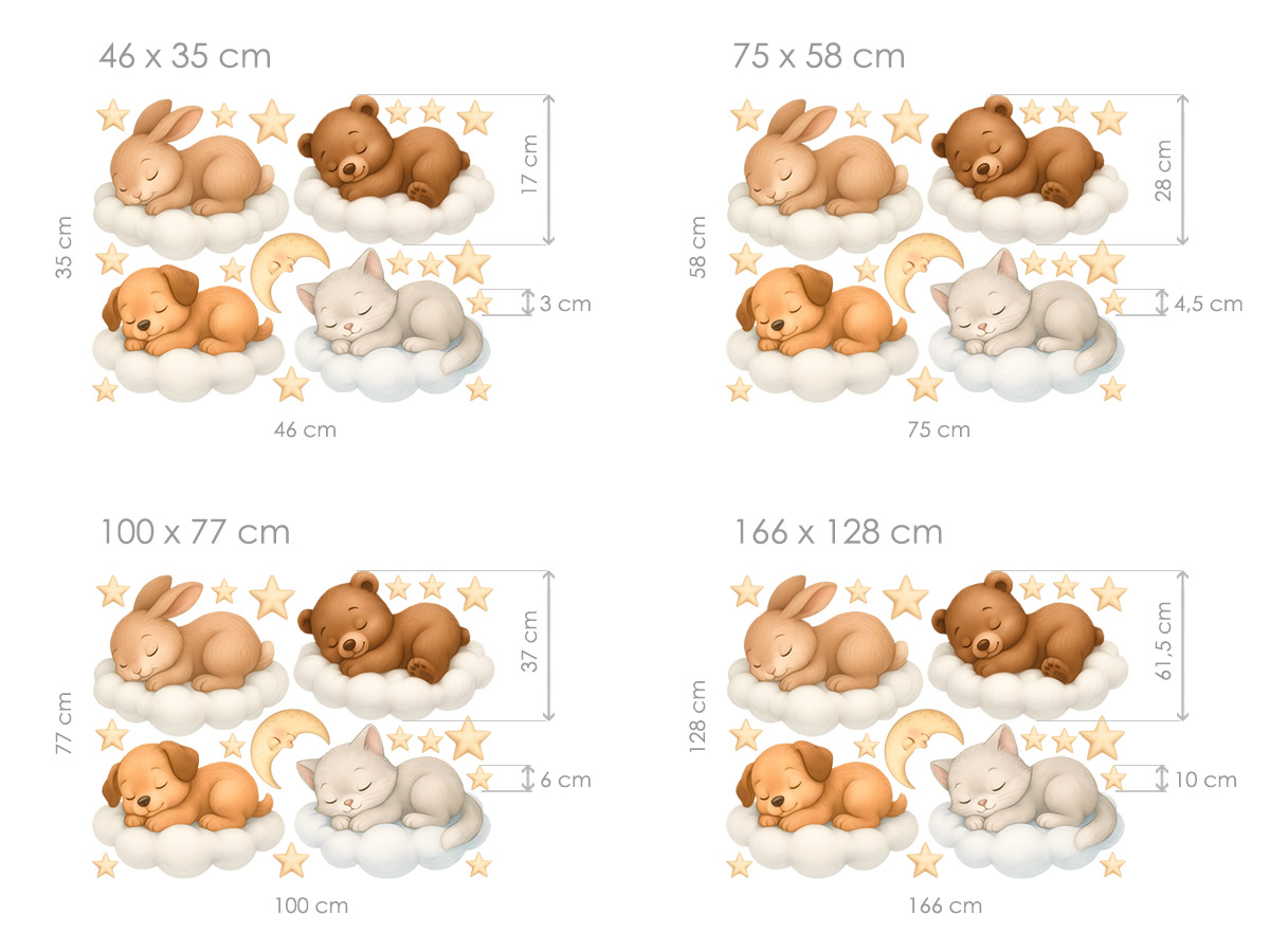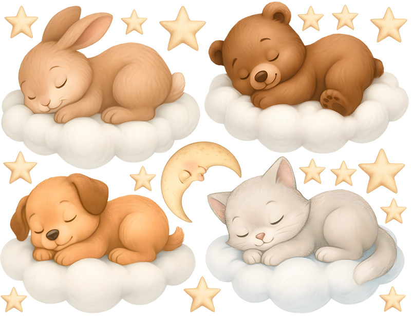 Samolepka na zeď „Zvířátka na obláčcích“ vnese do dětského pokojíčku jemnost, klid a kouzelnou atmosféru usínání. Roztomilý zajíček, medvídek, pejsek i kočička tu spokojeně odpočívají na měkkých nadýchaných obláčcích, zatímco kolem nich září něžné hvězdičky a usměvavý měsíc. Celý motiv je laděn do teplých, uklidňujících pastelových tónů, které působí harmonicky a perfektně zapadnou do prostoru malých dětí, zejména nad postýlku nebo do koutku na spaní. Arch obsahuje samolepky s jednotlivými samostatnými motivy, které lze libovolně rozmístit podle velikosti stěny nebo vlastní fantazie. Ideální volba pro vytvoření útulné, snové a bezpečné atmosféry, ve které se vašim nejmenším bude krásně usínat.
