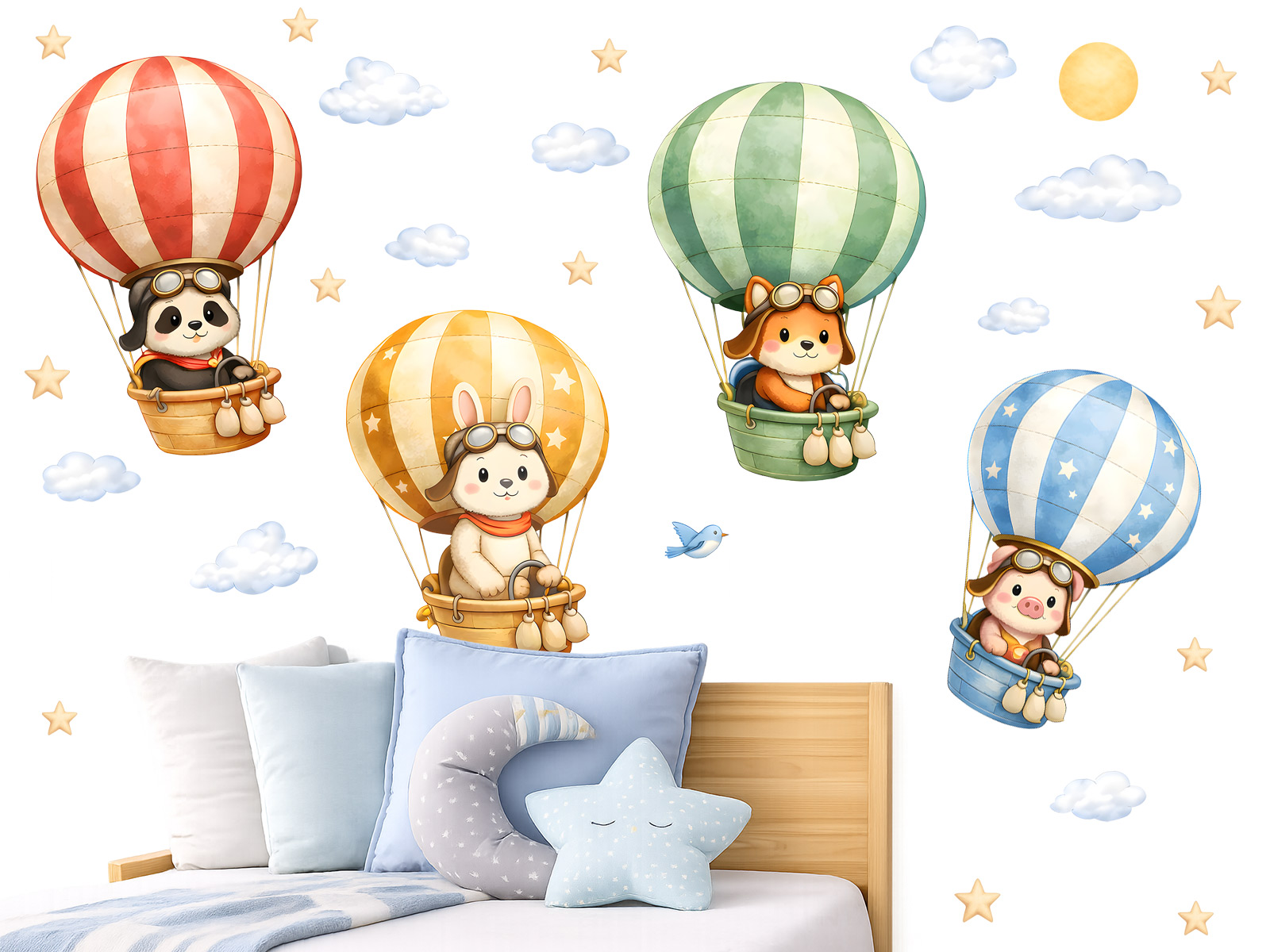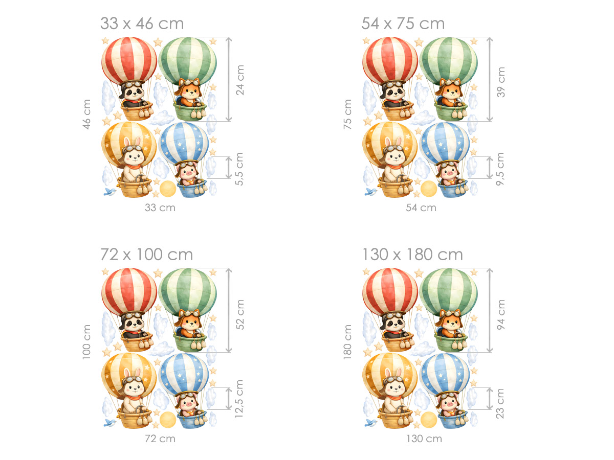 Vneste do dětského pokoje hravou fantazii a jemnou pohádkovou atmosféru s motivem roztomilých zvířátek v létajících balonech. Tyto něžné samolepky na zeď působí klidně, radostně a probouzejí dětskou představivost, jako by se pokojíček proměnil v tiché nebe plné snů, dobrodružství a bezpečí. Každý detail je laděný do měkkých barev, které navozují pocit pohody a útulna, takže se dítě může každý den probouzet do světa plného fantazie.
